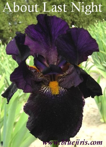 'About Last Night' (Paul Black, R. 1999). Seedling B137A. TB, height 30" (76 cm), Mid bloom season. Standards purplish black; style arms deep purplish black, black midline and tan edges; falls black, hafts veined cream; beards bright yellow gold, wide; pronounced sweet fragrance. 'Witches' Sabbath' X 'Oklahoma Crude'. Mid-America 1999.