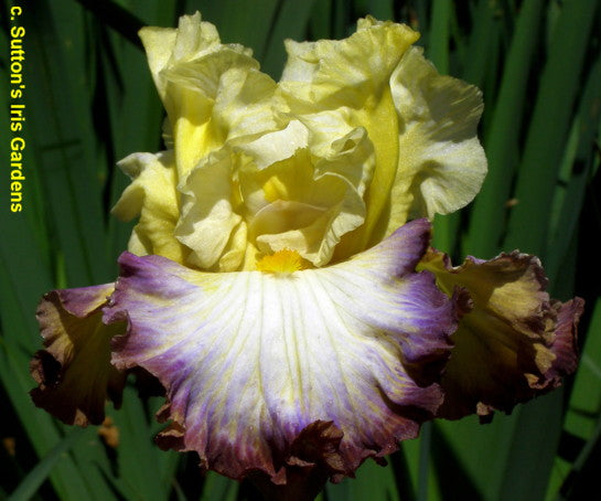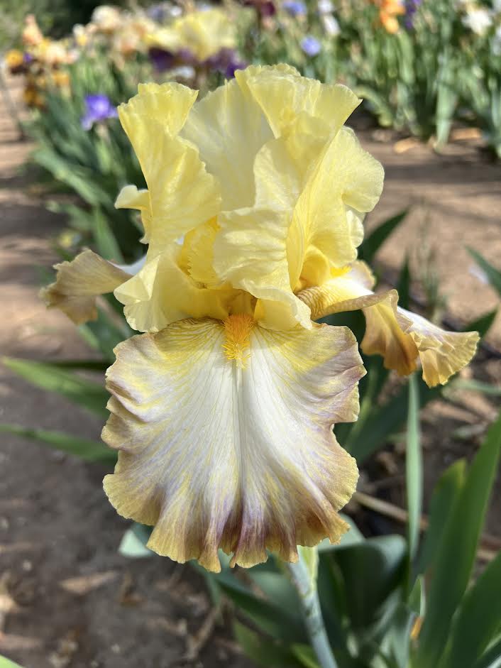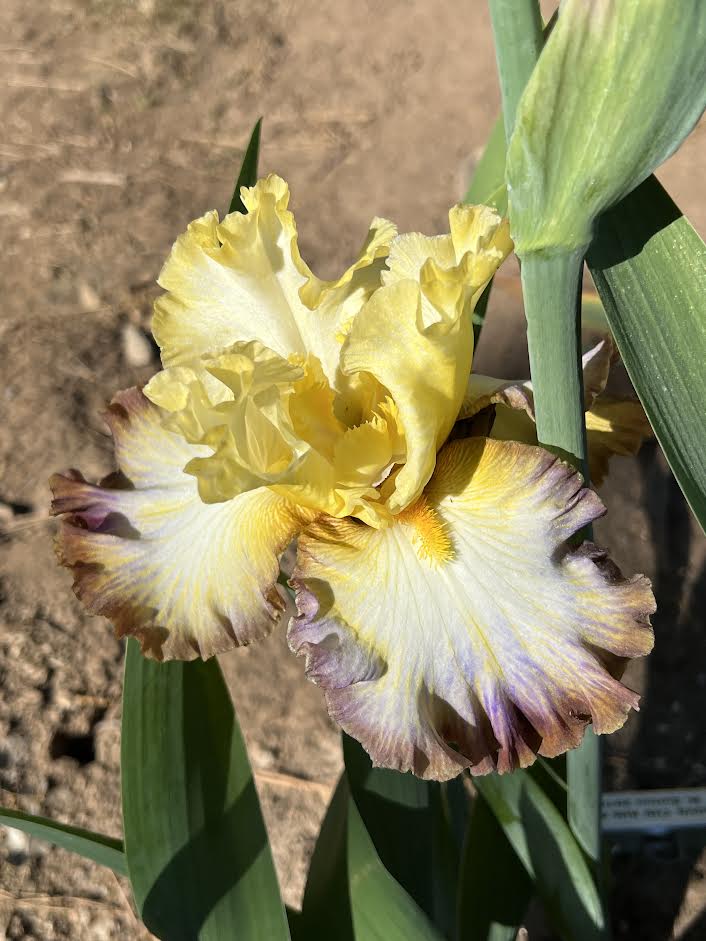 'Above The Rim' (Michael Sutton, R. 2010) Seedling U-743-A. TB, 34" (86 cm). Midseason to late bloom and rebloom. Standards yellow, paler at edge; style arms yellow; Falls. white, blending into bluebird blue band ¾ of way down, yellow shoulders and veining, 1/4" red purple edge; beards yellow orange; ruffled; slight spicy fragrance. Seedling Q-647: (M-7783: ('World Premier' x 'High Point') x seedling N-10032: ('Prince George' x 'Flight Commander')) X 'Mountain Sunrise'. Sutton 2011. Honorable Mention 2013.