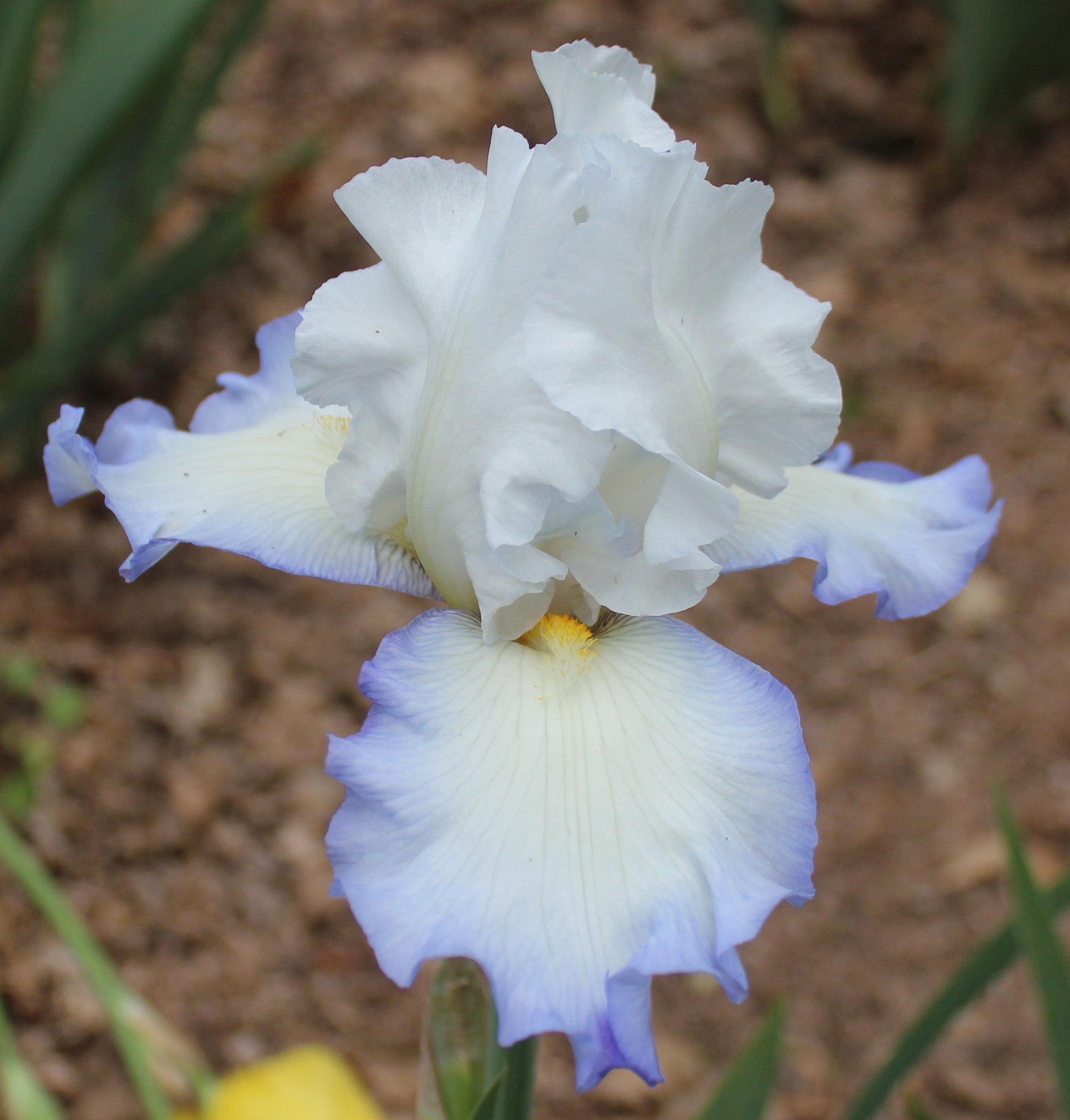 'Age Of Innocence' (Frederick Kerr by Stockton Iris Gardens, R. 1994). Seedling 88-03-02. TB, 38" (97 cm), Midseason bloom. Standards pure white; falls white, edged blue (RHS 92A); beards golden yellow (21A); ruffled; slight fragrance. 'Edith Wolford' X 'Condottiere'. Stockton 1994. Honorable Mention 1997.
