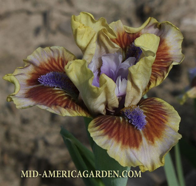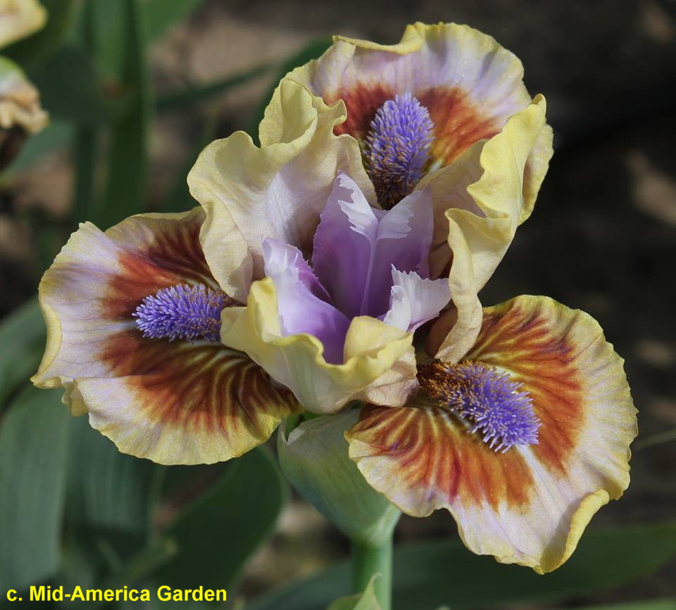 'Antsy' - (Thomas Johnson, R. 2017) Seedling TG285A. SDB, 14" (36 cm), Late midseason bloom. Standards tan to muted yellow; style arms light blue; Falls large brown spot encircled by a diffused yellow edge blending to a lavender washed band, yellow edge; beards brown and tangerine in throat, ends bushy blue; slight fragrance. 'Thump' X 'Lab'. Mid-America 2017. Honorable Mention 2022