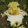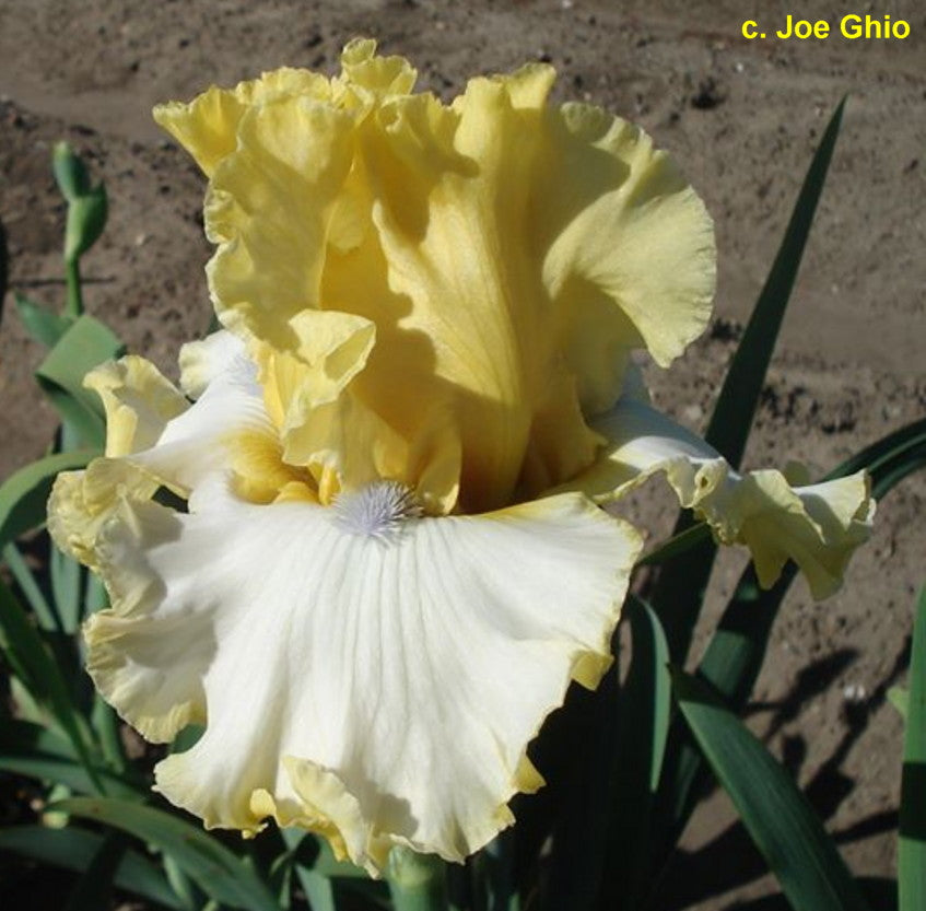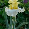 'Band Together' (Joseph Ghio, R. 2020). Seedling 13-122L6. TB, 37" (94 cm), Late midseason bloom. Standards antique lemon yellow; style arms yellow; falls white, underside lemon; beards creamy white shading to light blue at end. 'Beauty Becomes Her' X seedling 09-50H2: ('Pure and Simple' x seedling 06-8D3, 'Beauty Within' sibling). Schreiner 2020.