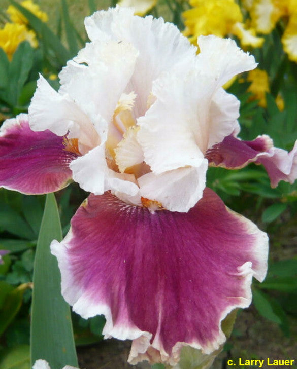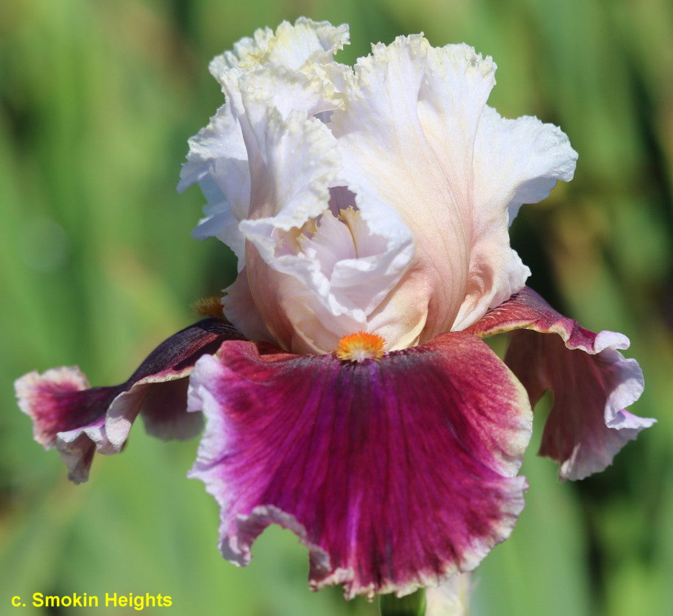 'Breezin' (Schreiner, R. 2018). Seedling A 81-A. TB, 39.5" (100 cm). Late midseason bloom. Standards snowy white; falls burgundy-red, well defined neat white edge; beards orange. 'Cranberry Swirl' X 'Decadence'. Schreiner 2018. Honorable Mention 2022.