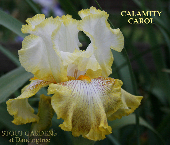'Calamity Carol' ( Richard Ernst, R. 2009). Seedling# W112-12. TB, 35" (89 cm). Late midseason bloom. Standards and style arms white; falls yellow ground, violet-magenta plicata markings and veining, white rim; beards orange; slight spicy fragrance. 'Zesting Lemons' sibling. Cooley, Tall Bearded Iris Society 2009.