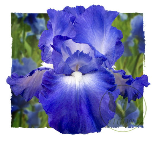 'City Lights' (Mary Dunn, R. 1990). Seedling# M87-1002-C. TB, 37" (94 cm). Midseason bloom and rebloom. Standards deep violet blue, lighter midrib; falls deep violet blue, large white area surrounding pale yellow beard. 'Fancy Face' X 'Windsurfer'. MAD Iris 1991. Honorable Mention 1993, Award of Merit 1995.