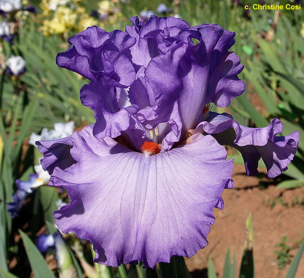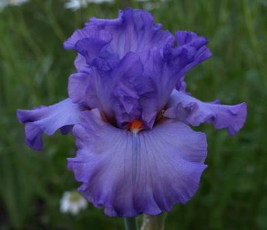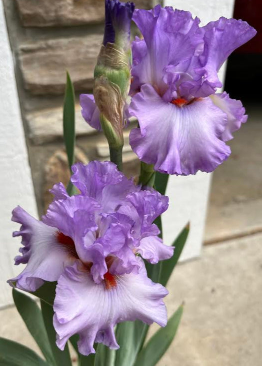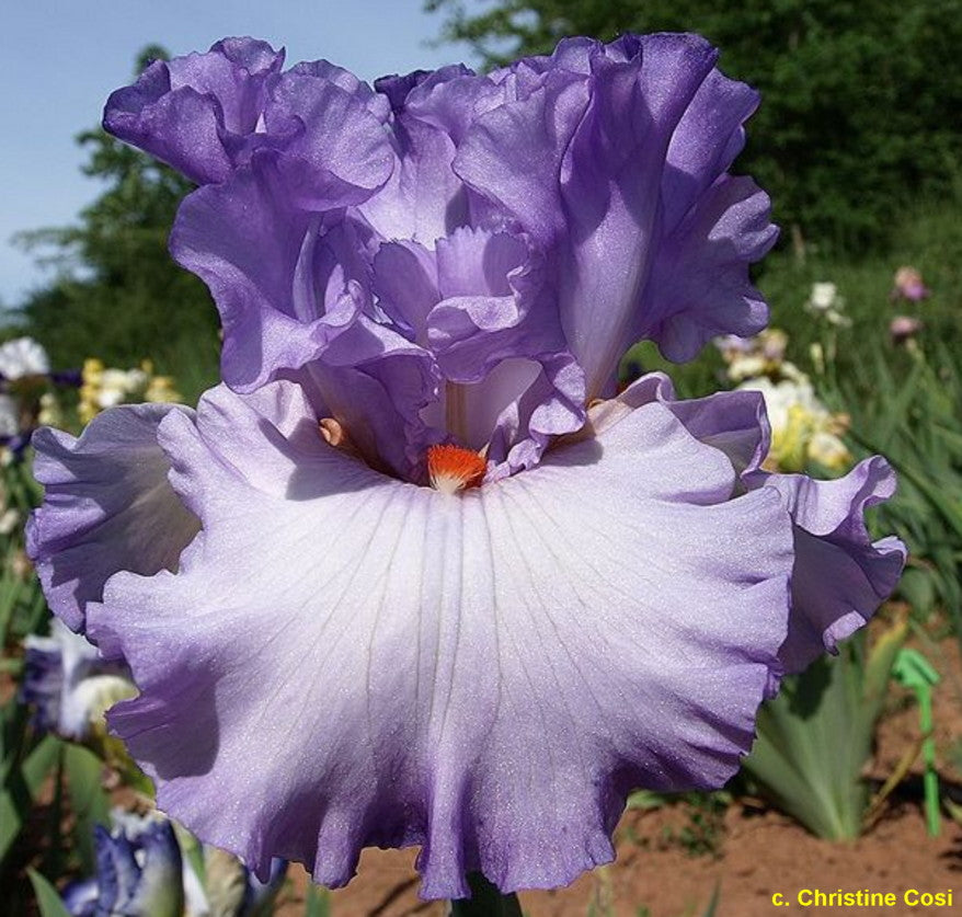 'Code Blue' (J. Terry Aitken, R. 2009). Seedling# 02T49B. TB, 36" (91 cm). Early midseason bloom. Standards and style arms light blue; falls light blue blending to white around bright red beard. Seedling# 99T14: ('Cranberry Delight' x 'Engaging') X seedling# 99T53: (seedling# 95T17: ('Cranberry Delight' x seedling# 87T49: (unknown x 'Persian Gown')) x seedling# 94T62: (seedling# 91T59: (seedling# 88T4: ('Hawaiian Queen' x 'Designer Gown') x 'Hawaiian Queen') x seedling# 91T29: (seedling# 87T199: ('Laced Cotton' x 'Anon') x 'Fantasy Lace'))). Aitken 2009. Honorable Mention 2011.