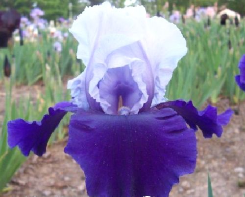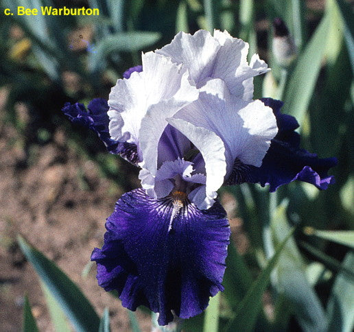 'Color Coded' (David Rawlins, R. 1981). Seedling# 73-3. TB, 30" (76 cm), Midseason to late bloom. Standards light blue; falls very dark blue; blue beard; slight fragrance. 'Yankee Boy' X 'Whole Cloth'. Hall's Flower Garden 1982. Favorite Guest 1983; Honorable Mention 1984; Favorite Guest 1984; President's Cup 1985, Favorite Guest 1985; Award of Merit 1986.