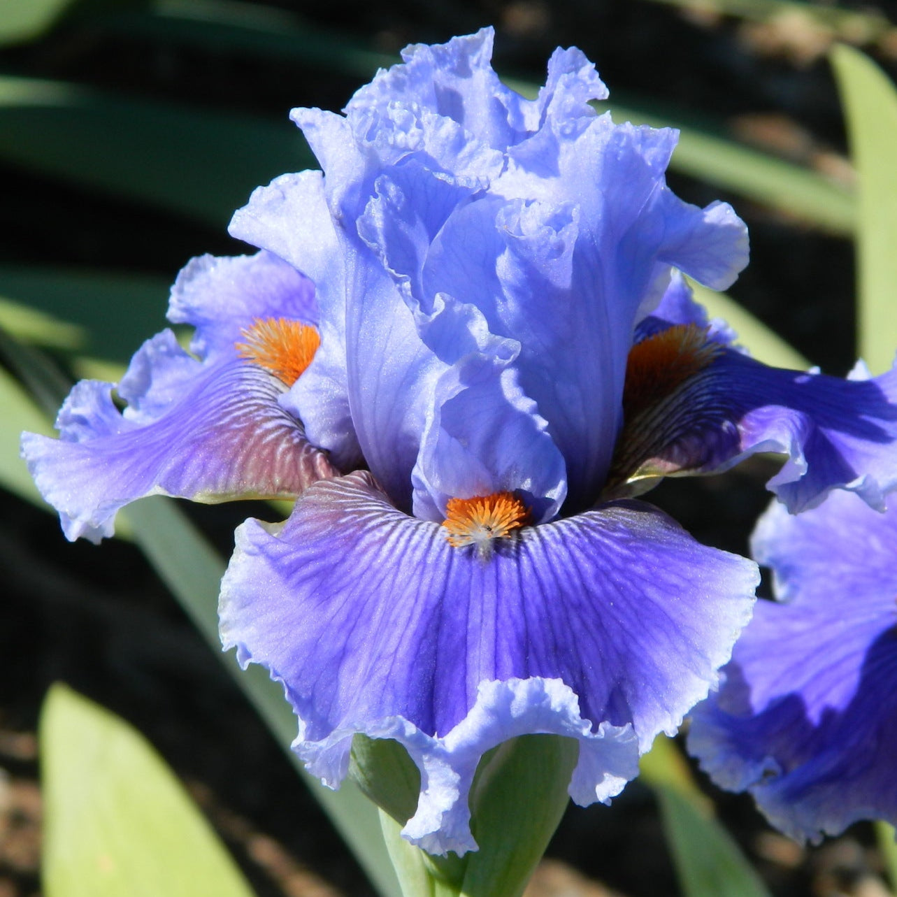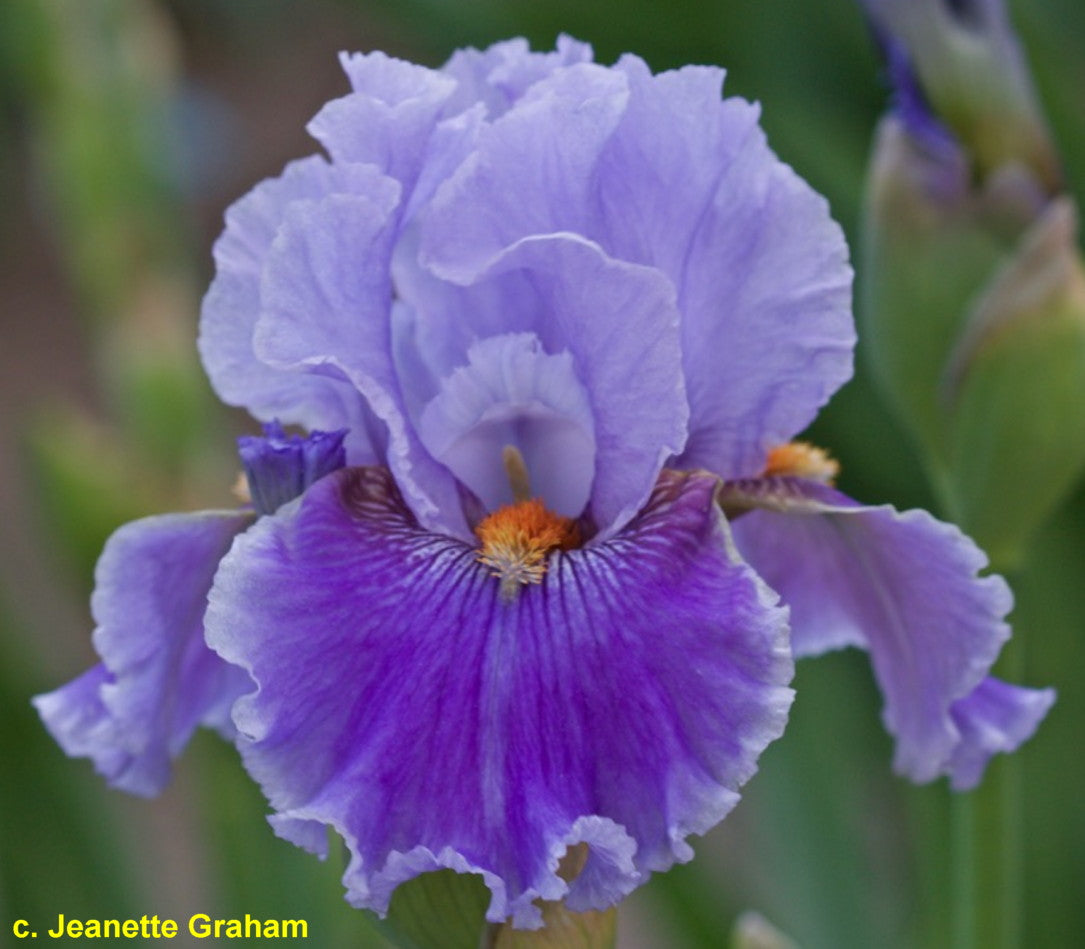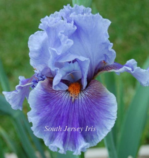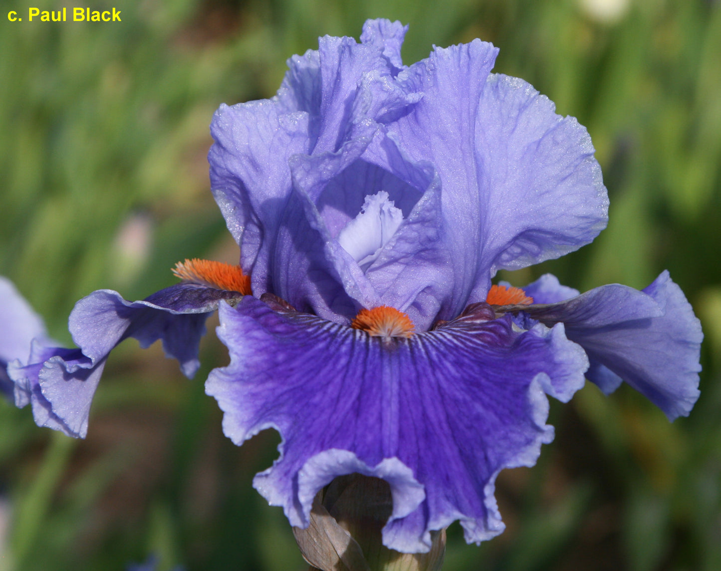 'Commanding Presence' (Paul Black, R. 2013) Seedling R182A. TB, 31" (79 cm), Early to midseason bloom. Standards light lavender-blue; style arms blue-white, pale violet ridge; falls mid dark lavender-blue blend, narrow light blue blended band, plum haft veined pale blue; beards orange; pronounced sweet fragrance. Seedling# O241A, 'Blue Seduction' pollen parent, X seedling# P92A, 'Very Very Good' pollen parent. Introduced by Mid-America 2014. Honorable Mention 2016.