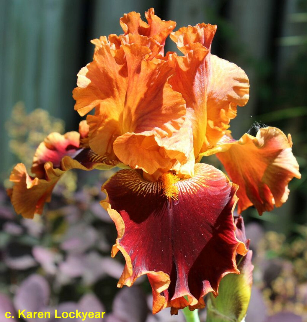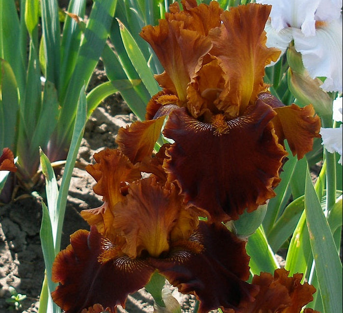 'Copatonic' (Barry Blyth, R. 1994). Seedling# Z79-1. TB, 32-34" (81-86 cm). Early to midseason bloom. Standards russet brown; falls plush ruby brown, 1/4" russet brown edge; beards bright mustard yellow; heavily ruffled. 'Swain' X 'Rustler'. Tempo Two 1994/95.