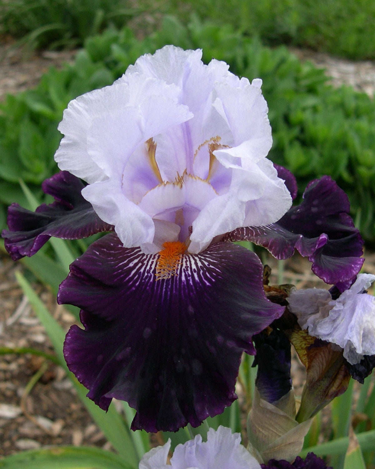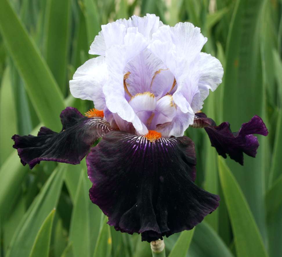 'By Design' (Frederick Kerr, R. 2004). Seedling# 98-054D. TB, 35" (89 cm), Midseason bloom. Standards and style arms blue white infused darker, stigmatic lip blue; falls near blue-black, narrow lighter edge, strong white ray pattern beside beard; beards tangerine red. 'Romantic Evening' X 'Gallant Theme'. Rainbow Acres 2005. Honorable Mention 2007.