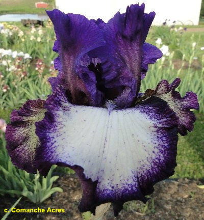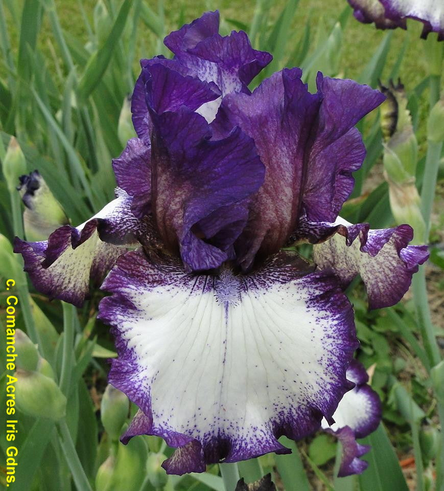 'Corey Remembered' (Mitch Jameson), R. 2013)-Seedling 02-04. TB, 34 (86 cm), Early midseason bloom and rebloom. Standards dark purple, white striations at midribs; falls white, dotted and stitched borders of dark purple, underside of petals pale yellow; beards white, blue tips turning yellow in throat; ruffled. 'Decker' X 'Ozark Rebounder'. Comanche Acres 2013. Honorable Mention 2017; Award of Merit 2021.