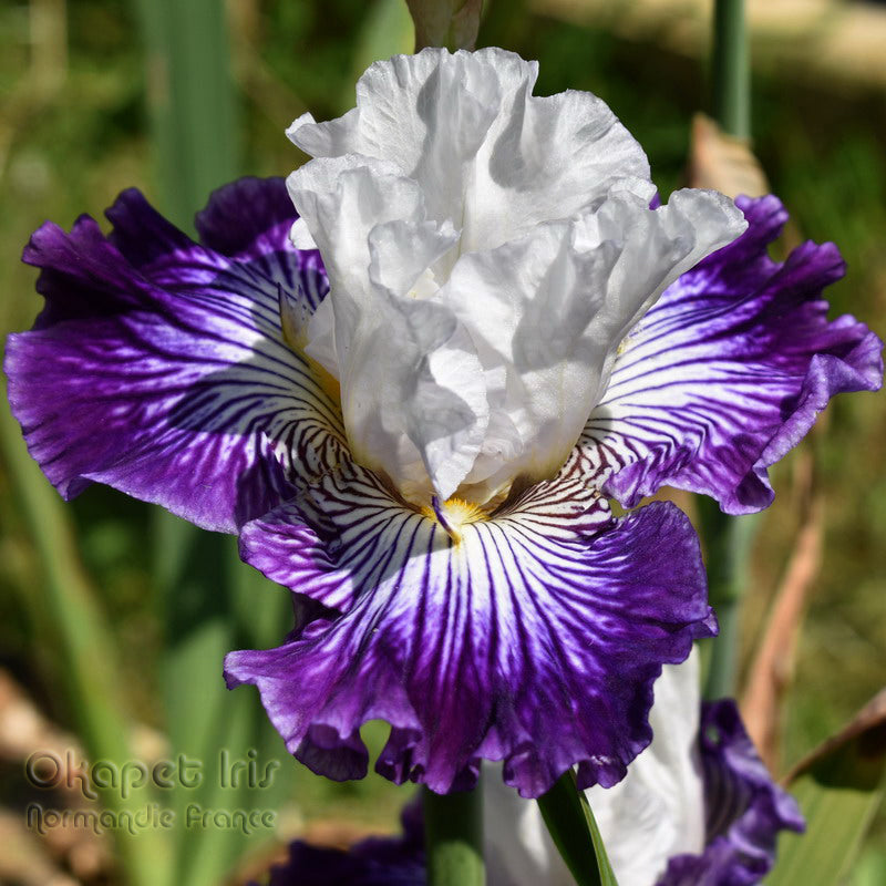 'Crossed The Line' (Michael Sutton, R. 2016) Seedling Y-1137-C. TB, 31" (79 cm). Midseason to late bloom and rebloom. Standards white, purple and brown wire edge; style arms white, golden yellow veining, golden brown crests; Falls white, lined and edged dark blue-violet; beards yellow, fuzzy horns yellow at base, white in middle, blue-violet at ends; ruffled; serrated; slight musky fragrance. 'Snow Creek Falls' X 'Cold Fusion'. Sutton 2016.