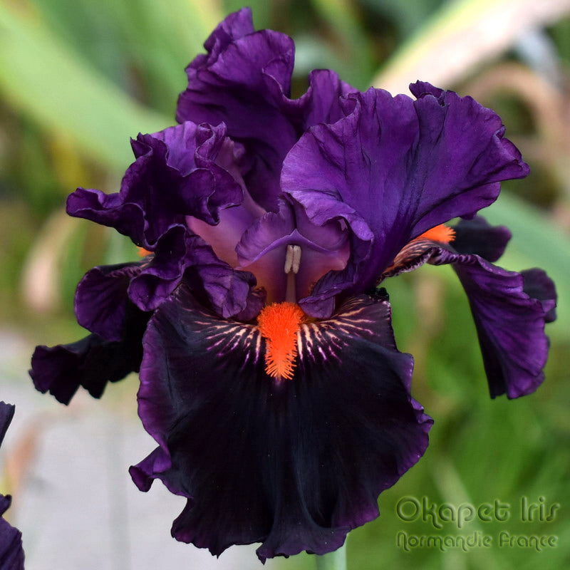 'Daffy Duck' (Paul Black, R. 2016) Seedling U35B. TB, 45" (114 cm), Midseason to late bloom. Standardsdark red purple; style arms mid-dark red purple, mid mauve pink edge; Falls velvety purple black, slightly lighter narrow band, cream on each side of beard with black veins; beards bright red orange; slight spicy fragrance. 'Very Very Good' pollen parent X 'Sharp Dressed Man'. Mid-America 2016. Honorable Mention 2018; Award of Merit 2021.