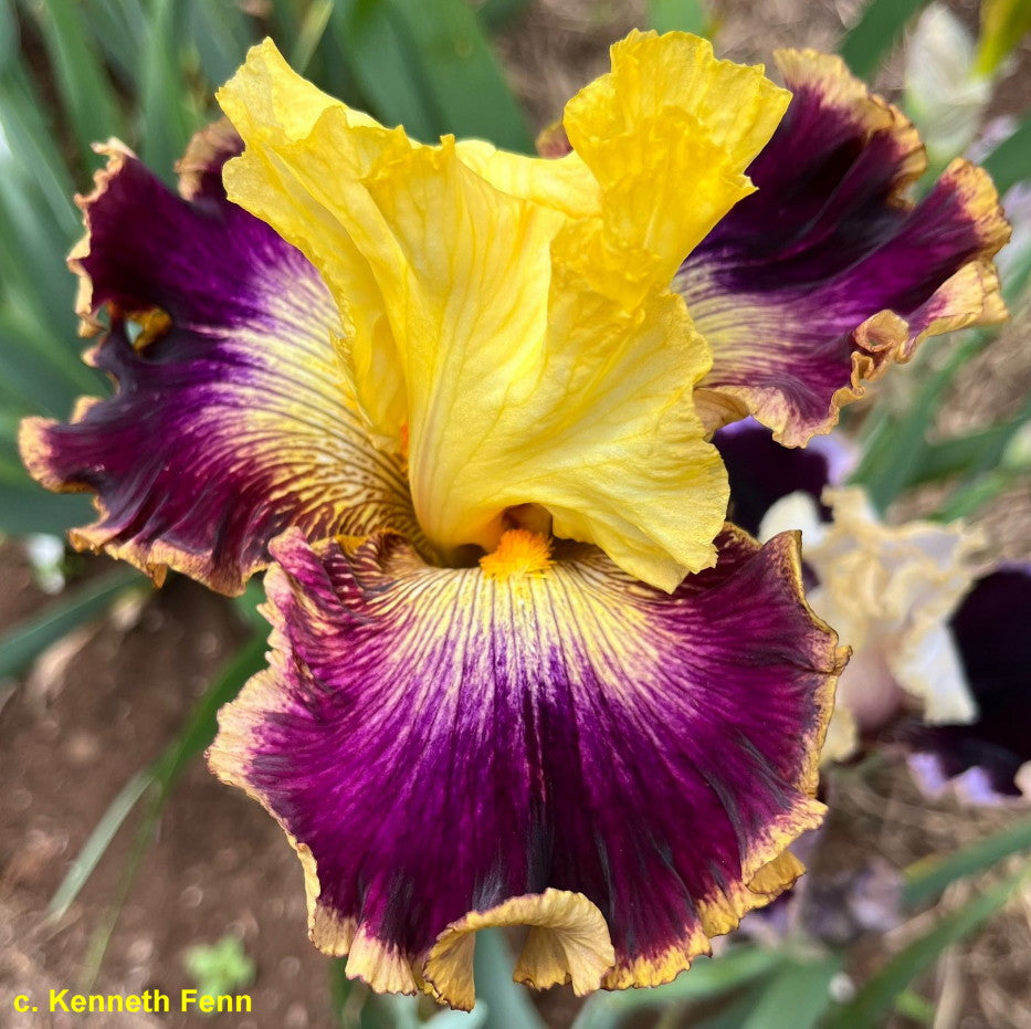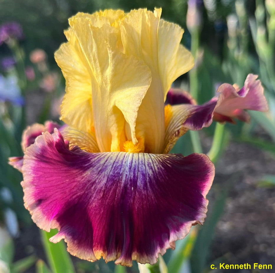 'Daylight Savings' (Michael Sutton, R. 2020). Seedling AZ-646-B. TB, 35" (89 cm), Midseason bloom. Standards and style arms yellow; falls yellow zone around beard blending into ruby red half way down petal, ½˝ pale yellow rim; beards yellow; serrated; slight sweet fragrance. Seedling Z-447-C: ('Fruited Plain' x 'Static Electricity') X seedling Z-902-A: ('Solar Burst' x 'Cold Fusion'). Sutton 2021.