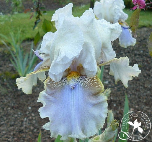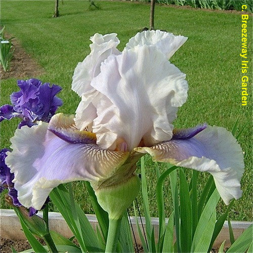 Devil David' (Anna and David Cadd, R. 2000). Seedling 30-93-1. TB, 38" (97 cm), Midseason bloom. Standards light creamy lavender to silver grey; style arms white; falls grey white, light lavender center wash, shoulders tan with white markings; beards violet on outer half, deep yellow in throat, small purple horn with white hairs; slightly ruffled; pronounced sweet fragrance. 'Colortart' X 'Deity'. Cadd 2001. Honorable Mention 2004; Award of Merit 2008