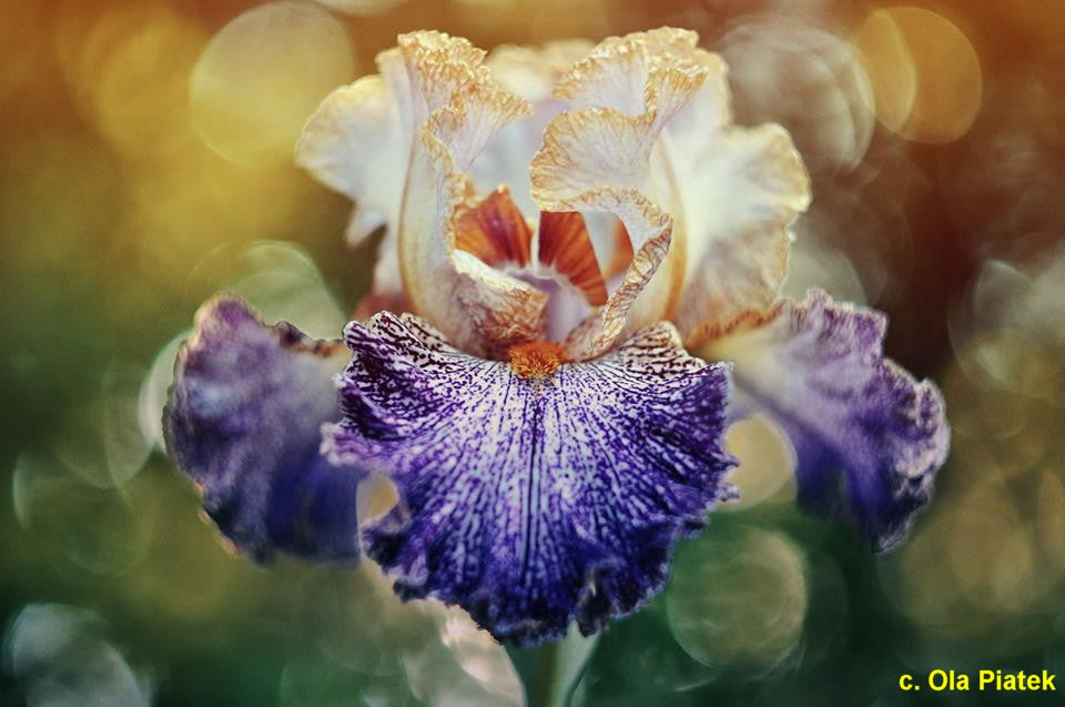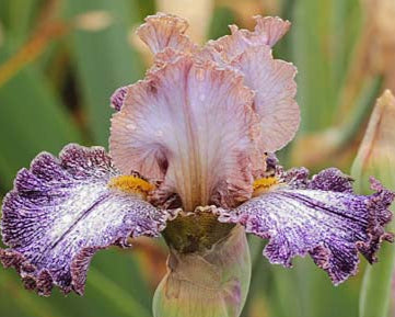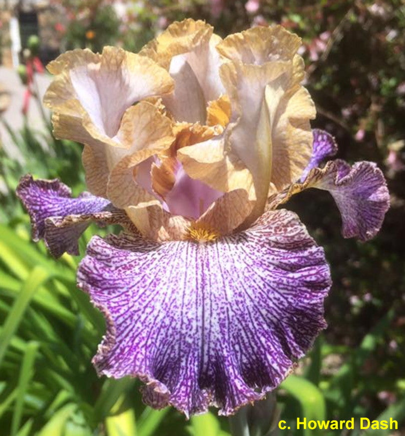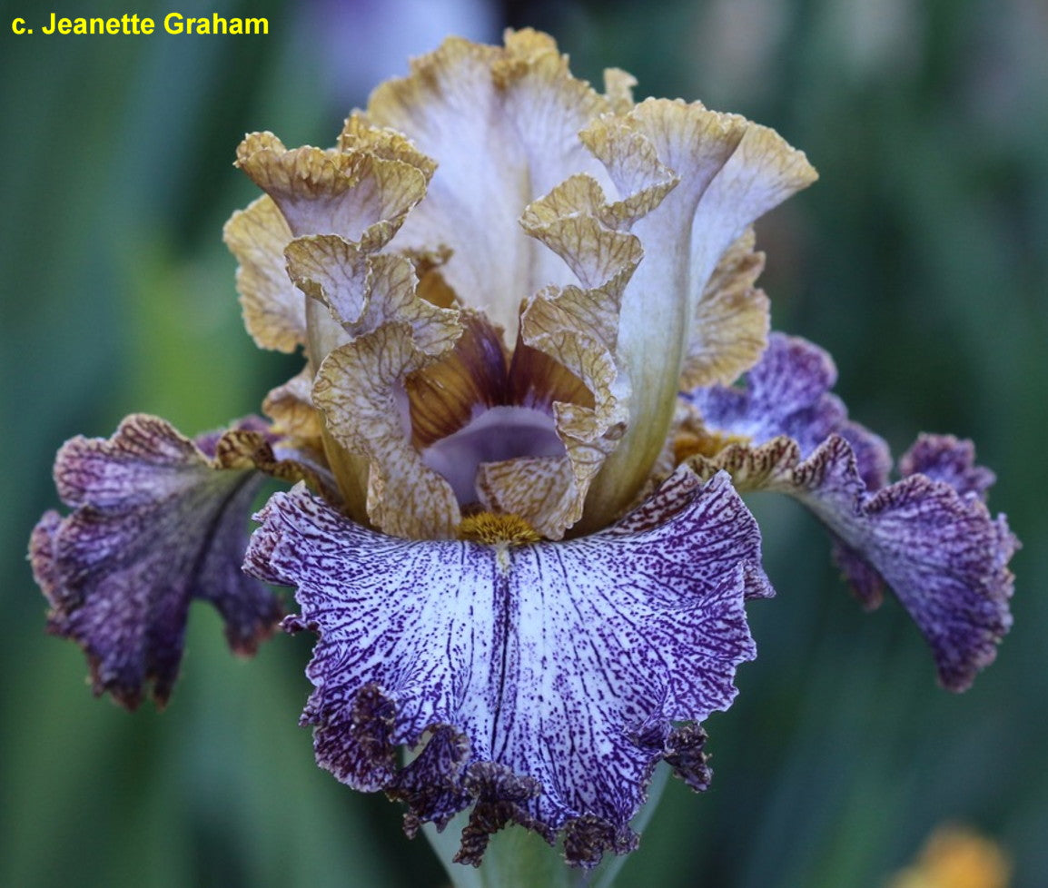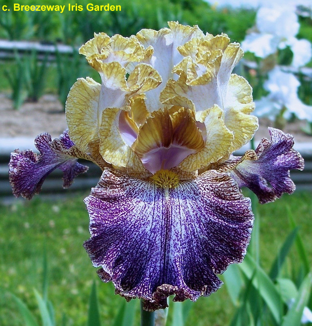 Dipped In Dots' ( Paul Black, R. 2011) Seedling O174XX. TB, 46" (117 cm). Late to very late bloom. Standards chalky slate white, greenish gold flush up midrib, wide brassy gold blended band; style arms brassy gold, rust tan streaks up crests; Falls white, plicata washed mid purple overall becoming heavier toward edges, narrow plum brown band rimmed brass gold; beards violet white base, tips old gold, brown in middle; pronounced sweet fragrance. 'Magic Masquerade' X 'Ring Around Rosie'. Mid America 2012. Honorable Mention 2014, Award of Merit 2016..