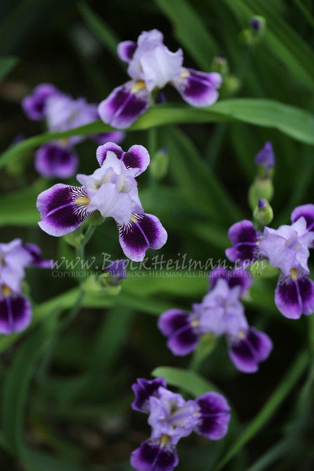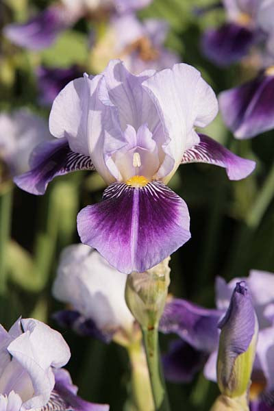 ''Dividing Line' (Charles Bunnell, R. 2004). Seedling #G52-1. MTB, 22" (56 cm), Midseason bloom. Standards pale blue violet (RHS 92C) fading to blue white; style arms pale purple; falls pale purple (76A), bisected by pale purple midline, violet spot (80A) and white haft markings; beards yellow. Seedling #D45-2: ('Lucky Mistake' x Pallida Variegata, 'Zebra') X seedling #D41: ('Welch's Reward' x 'Oshel Blue'). Miller's Manor 2005. Honorable Mention 2007; Ben Hager Cup 2007; Award of Merit 2009; Ben Hager Cup 2009; Williamson-White Medal 2011, American Dykes Medal 2014.