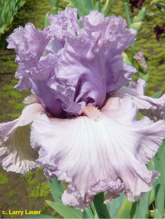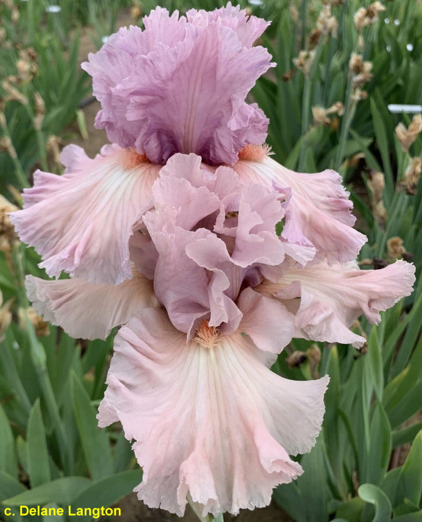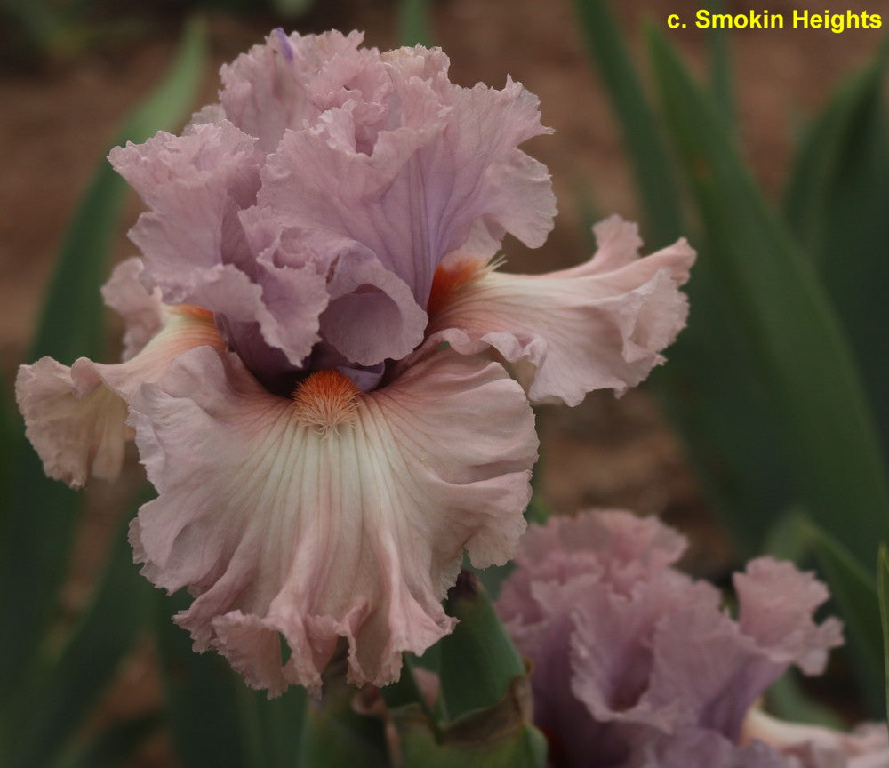 'Edwardian Era' (Keith Keppel, R. 2017). Seedling 12-41J. TB, 38" (97 cm). Late midseason bloom. Standards light lilac (M&P 41-C-4), deeper (42-E-6) toward center; style arms lilac (42-C-2), lavender lip; falls pale lilac-pink (41-BC-3) grading to warm white center, hafts flushed pale rose-pink (3-C-9); beard hairs based white, coral (2-I-12) in middle, ends white. 'Strawberry Shake' X 'Marital Bliss'. Keppel 2018. Honorable Mention 2021, Award Of Merit 2024.