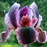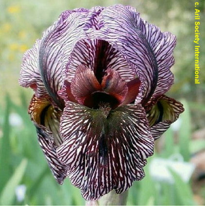 'Emerald Fantasy' OGB+ (Harry Tate by Donald Shepard, R. 1983). Seedling 83-TS-1. AB, 26" (66 cm), Early to late bloom. Creamy lavender ground with heavy webbing of rich dark purple, solid up midrib of Standards; black signal with greenish cast; green pollen; black beard; burgundy red style arms; slight fragrance. ('Joppa Parrot' x 'Beisan Aga') X I. korolkowii, v. Brown and Green. Shepard Iris Garden, 1983.