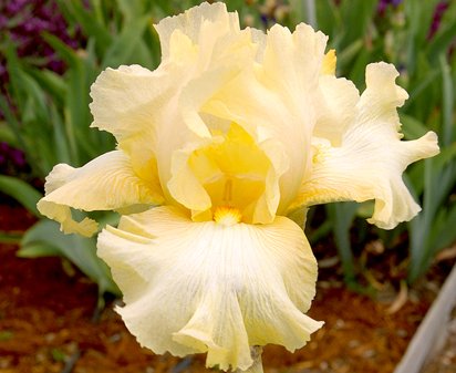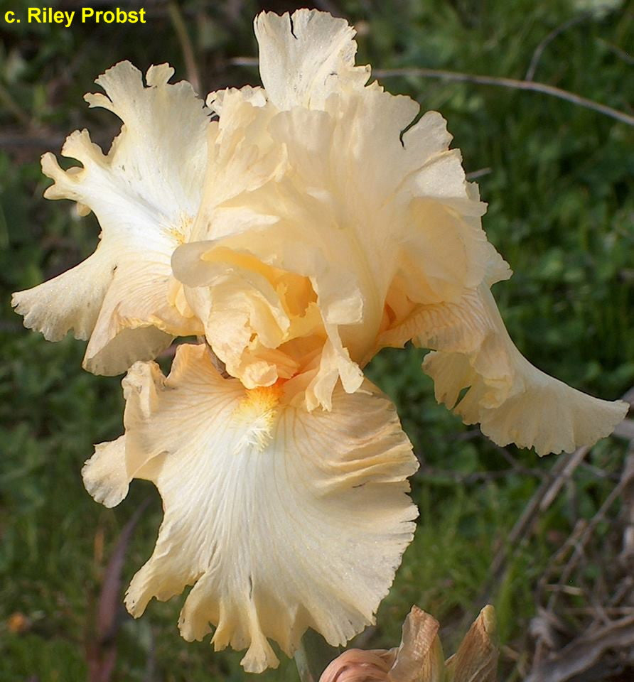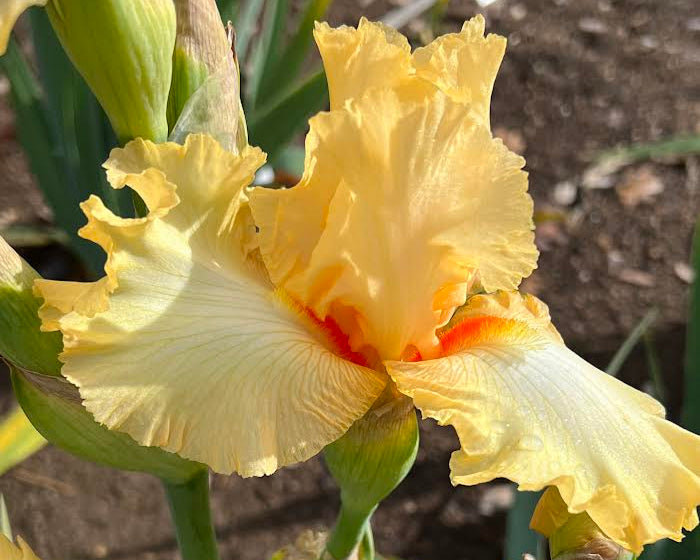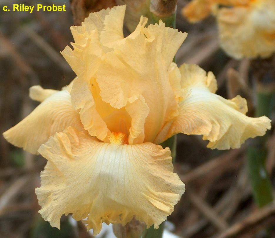 ''Fall Empire' (George Sutton, R. 2001). Seedling# J-26. TB, 32" (81 cm), Late midseason bloom and rebloom. Standards and style arms naples yellow (RHS 11C); falls empire yellow (11D), cream around beard; beards orange, yellow at end; ruffled; slight sweet fragrance. 'Saxon' X 'Orange Popsicle'. Sutton 2002.