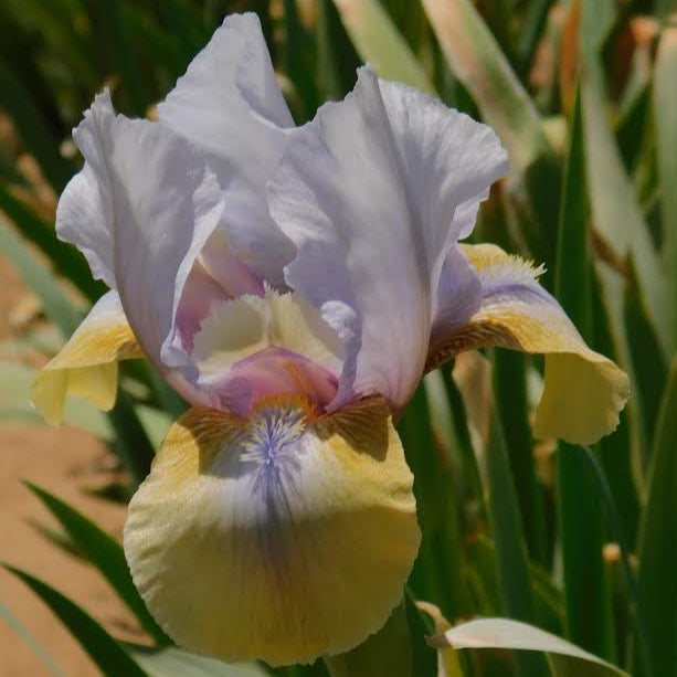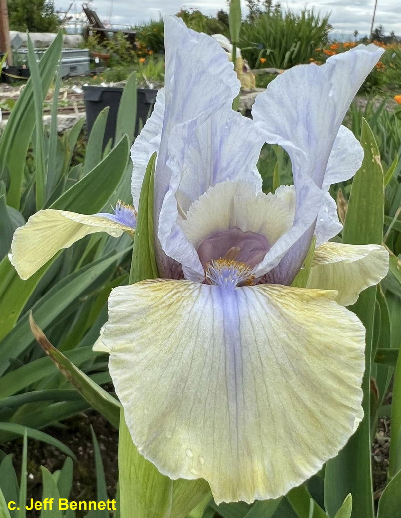 ''Fall In Line' (Carl Boswell, R. 1984). Seedling #181-75-21. AB. (OGB-) 17" (43 cm), Midseason bloom. Standards pale blue white; Falls pale chartreuse white, darker hafts, blue white blaze in center, blue mid-line down center; blue beard tipped orange. ('Gingerbread Man' x I. balkana ) X 'Welcome Reward'. Boswell, 1985. Honorable Mention 1987.