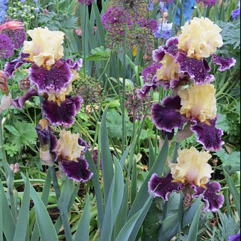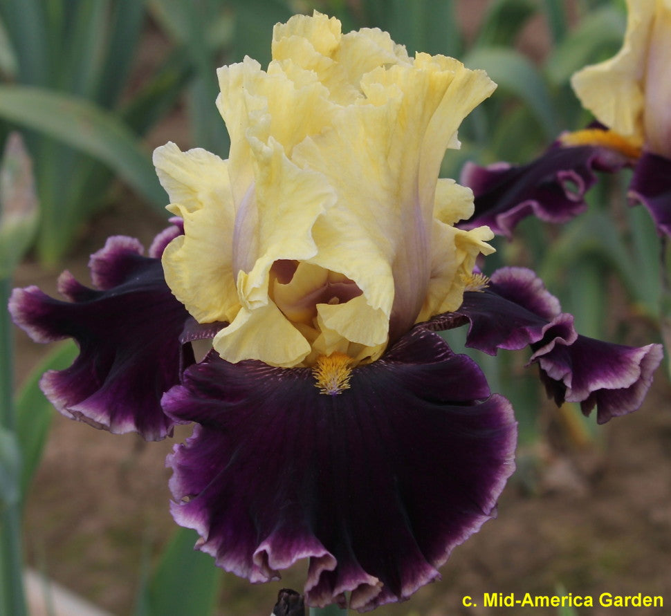 Football Hero' (Lynda Miller, R. 2014). Seedling# 8010A. TB, 36" (91 cm). Midseason bloom. Standards butter yellow; style arms same, accented violet; falls plum-purple, pale smoky orchid edged; beards gold; slight musky fragrance. 'Hoosier Dome' X 'Saturn'. Salmon Creek 2015. President's Cup 2015; Honorable Mention 2017; Award of Merit 2019; John C. Wister Medal 2021; American Dykes Medal 2022.
