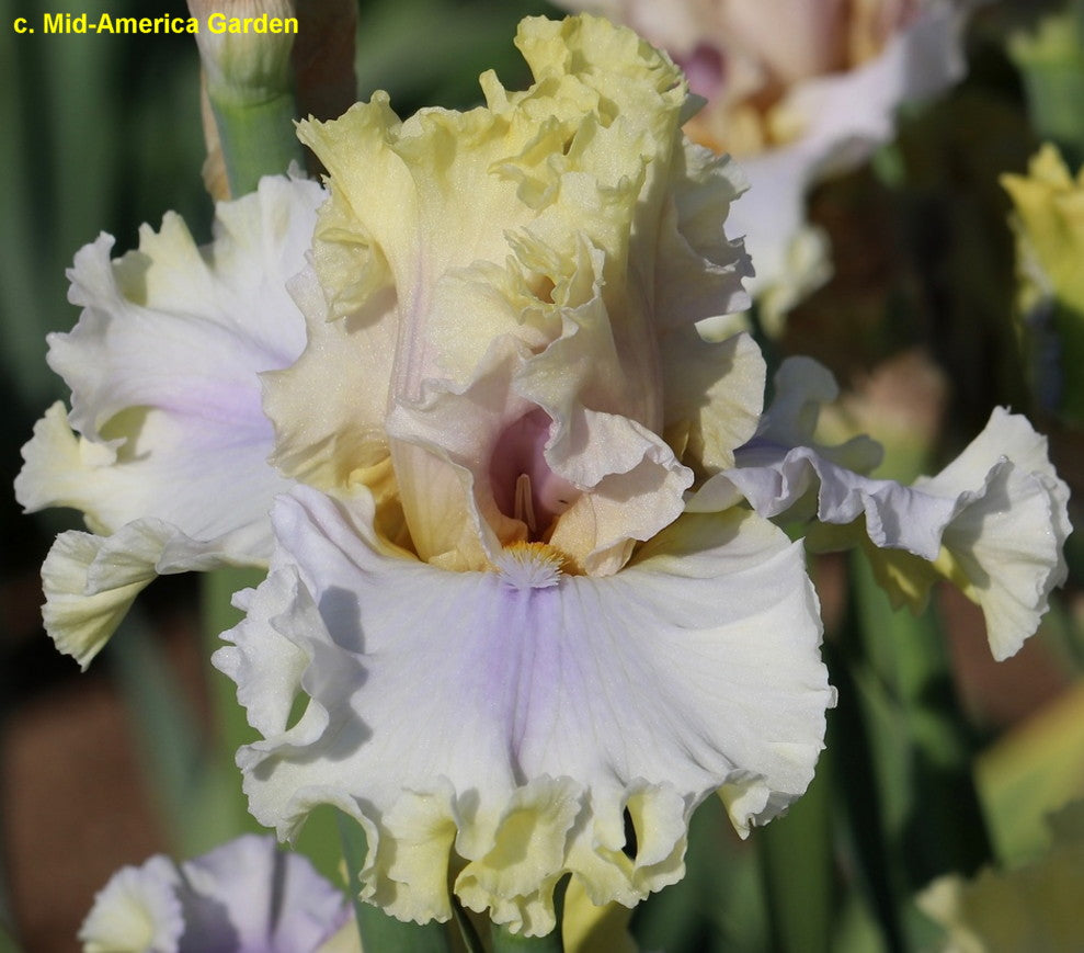 'Gentle Manner' (Keith Keppel, R. 2019). Seedling 12-36A. TB, 38" (97 cm), Midseason bloom. Standards and style arms pale cream yellow (M&P 9-CD-1) faintly infused lavender-blue; falls paler cream white (9-AB-1), pale lavender flush below beard; beards dandelion (9-L-4), ends lavender white. 'Gentle Reminder' X 'My Lady’s Manor'. Keppel 2020. Honorable Mention 2022.