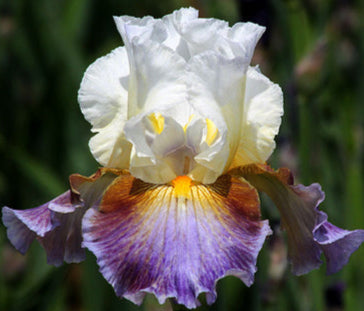 'Get Back' (Larry Lauer, R. 2014). Seedling# 2917-2. TB, 35" (89 cm), Midseason bloom and rebloom. Standards and style arms white; falls aster violet (RHS 87C) darkening to sea lavender-violet (87A) towards rim lightening back to aster violet, copper brown (176B) shoulders lightening to peach-beige (174B) toward beard; beards cadmium orange (23A) in throat, indian yellow (17B) in middle, buttercup yellow (16C) at end; ruffled; pronounced sweet fragrance. 'Flash of Light' X 'Carry On'. Lauer 2015. Honorable Mention 2017; Award of Merit 2019.