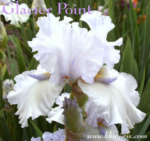 'Glacier Point' (Richard Tasco, R. 1997). Seedling# 93-38-08. TB, height 38" (97 cm). Early to midseason bloom. Lightly ruffled very pale blue self, aging white; beards pale violet at end, white center section, tangerine in throat, with violet horn. 'Classy Chassy' X 'Art School Angel'. Superstition 1998. Honorable Mention 2000; Award of Merit 2002. Novelty.