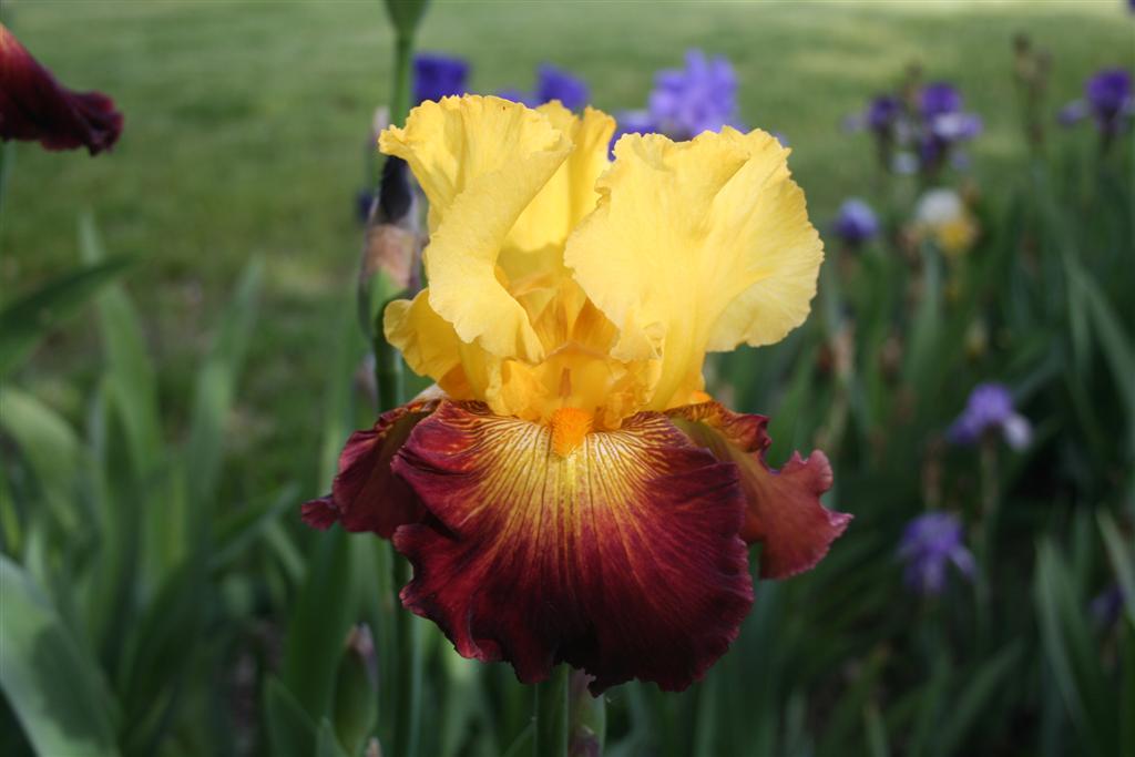 'Glowing Red Lantern'. (Leonard and Kathie Jedlicka, R. 2007), Seedling# Jeda 4-3M11. TB, Height 34" (86 cm), Midseason bloom. Standards bright yellow; style arms yellow-orange; falls red, yellow stripes radiating around bright orange beard; lightly ruffled. 'Starship Enterprise' X 'Terryton'. Blue J Iris 2008.