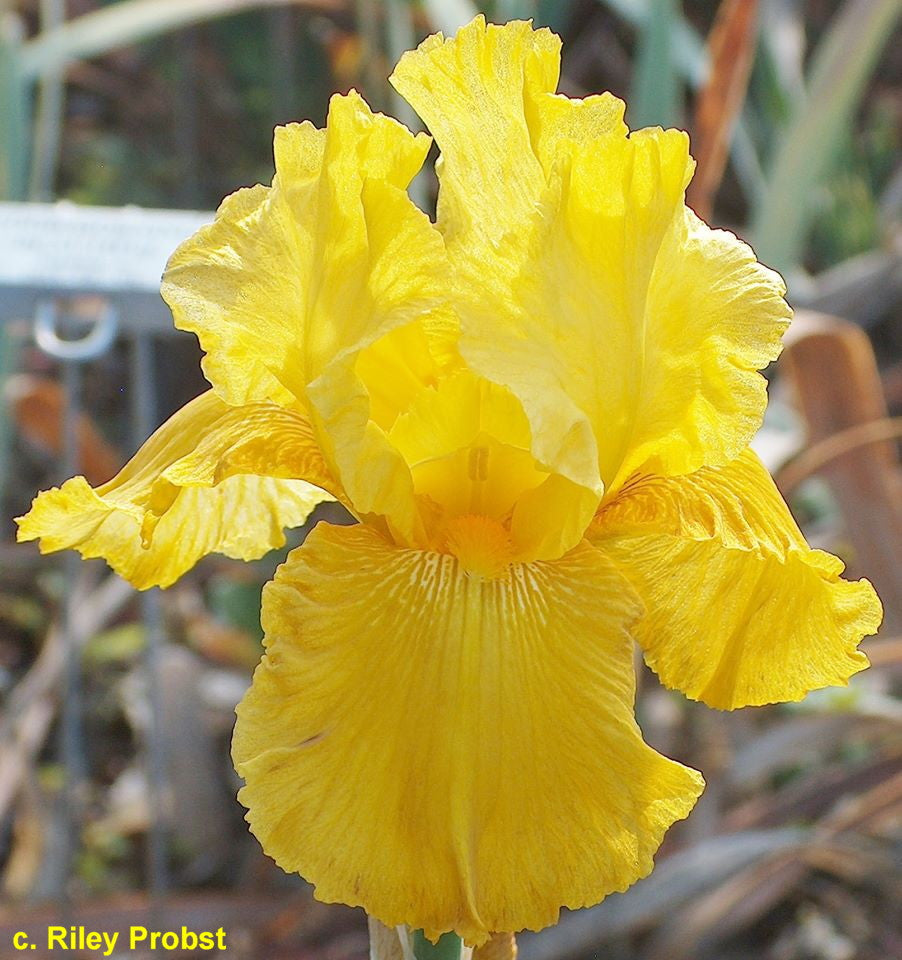 'Gold Reprise' (Walter Moores, R. 1987). Seedling# 80-14-A. TB, 32" (81 cm). Early bloom and rebloom (October ln Texas). Golden yellow bitone, golden yellow texture veining in white area surrounding golden yellow beard. ('Sunset Snows' x 'Second Look') X 'Soft Halo'. Moores 1988.