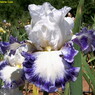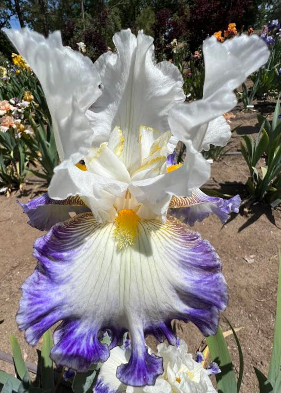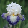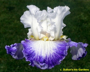 'Grand Bargain' (George Sutton, deceased, by Michael Sutton, R. 2014). Seedling W-206-C. TB, 35" (89 cm), Early to late bloom and rebloom. Standards and style arms white; falls white blending into a 1˝ violet-blue band, ice blue edge; beards white, hairs based white, tips yellow; slight spicy fragrance; ruffled. 'Rim Of Fire' X seedling S-604: (seedling M-146: (('Yaquina Blue' x 'American Eagle') x 'Applause Line' pollen parent) x 'Mountain Sunrise'). Sutton 2014. Honorable Mention 2017.