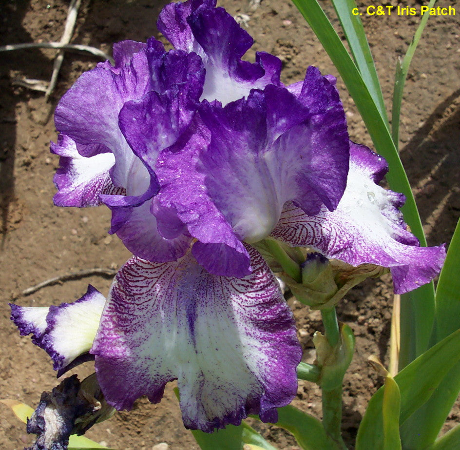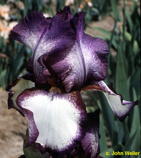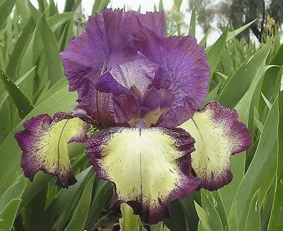 'Grape Accent' (Lura Roach, R. 1972). Seedling# 68-35. TB, 38" (97 cm), Late midseason bloom and rebloom. (September until frost). Standards stippled cream with 1 1/4" border of solid beet root purple (RHS 830); falls clean cream center, bordered and stitched beet root purple, oxblood red blush at haft; brown beard tipped violet. 'Grand Spectator' X 'Stepping Out'. Riverbank Gardens 1973.