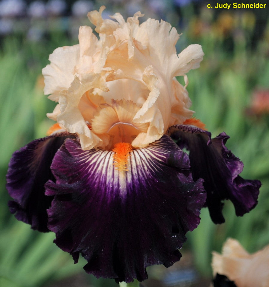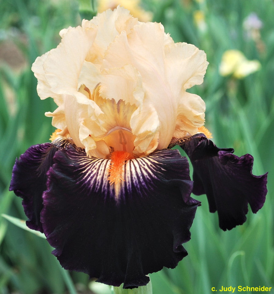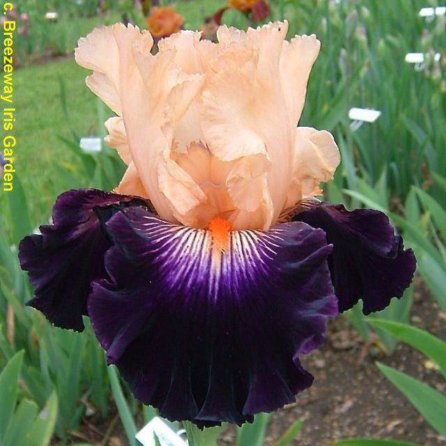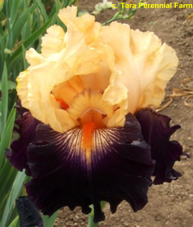Greatest Show On Earth' (Frederick Kerr, R. 2009). Seedling# 04-044A. TB, 36" (91 cm). Midseason bloom and rebloom. Standards medium melon-orange; style arms orange; falls velvet black, white area with dark veins around beards; beards melon, hairs tipped tangerine. 'Modern Era' X seedling# 01-031B: (seedling# 99-088A: 'Lena Baker' x seedling# 97-021A: ('Fresno Frolic' x 'Dear Jean')) x 'Next Millennium'). Rainbow Acres, Stanton 2010. Franklin Cook Cup 2012, Honorable Mention 2012; Award of Merit 2014.