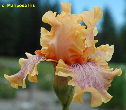 'Heardit Thruda Grapevine' (Douglas Kanarowski, R. 2011). Seedling# 0299. TB, 38 (97 cm), Midseason late bloom. Standards orange heavily infused peach; style arms orange; falls orange, entire center overlaid grape violet veins; beards bright tangerine; very ruffled; slight sweet fragrance. Seedling# 060: ('Caption' x 'Calypso Bay') X 'Goldkist'. Mariposa 2011.