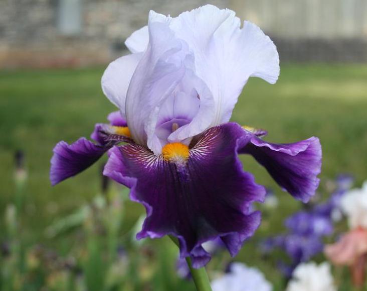 'High Point' (George Sutton, R. 1998). Seedling# H-206-F. TB, 38" (97 cm), Late midseason bloom and rebloom. Standards and style arms white, tinted pink; falls plum purple (RHS 79A), white and pale violet 3/8" blended edge; beards yellow orange, short red violet horn; ruffled; slight sweet fragrance. Seedling# F-68: ('Thornbird' x 'Platform') X 'Sweet Reflection'. Sutton 1999.