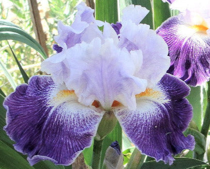 'Hope Rises' (Margie Valenzuela, R. 2013). Seedling# FWGP-8L. TB, 34" (86 cm), Early midseason to late midseason bloom. Standards pale orchid to white blending to lavender-light purple toward center, darker at midribs; style arms white to pale-orchid; falls white-washed purple exposing white veining and rim around edges, white around beard, small white dart below beard; beards orange in throat and middle, white end, hairs tipped orange; luminata. 'Fancy Woman' X seedling# DC-06-08: ('Double Click' x seedling# 20205-01: (seedling# 02-98: ('Pencil Sketch' x 'Sapphire Hills') x 'Flights Of Fancy')). Nola’s 2014.