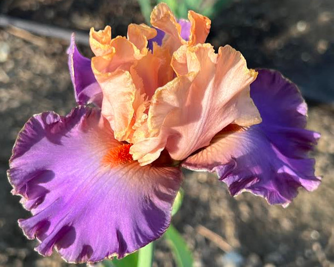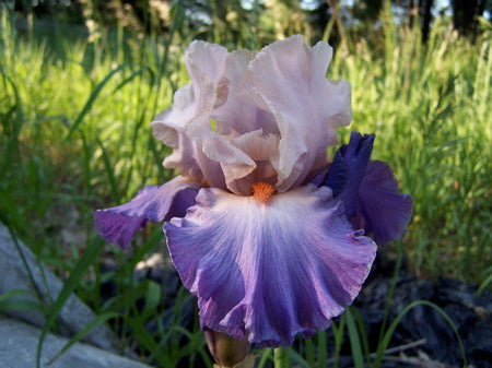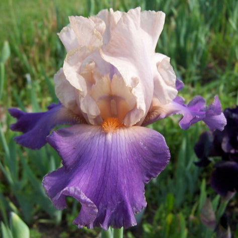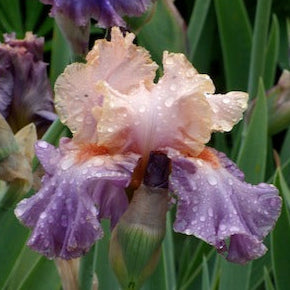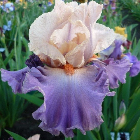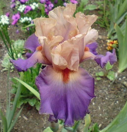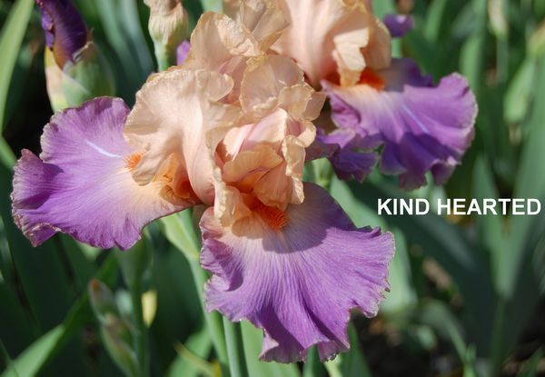 'Kind Hearted' (Thomas Johnson, R. 2002). Seedling# R71B. TB, 45" (114 cm), Midseason to late bloom. Standards peach buff, crystalline gold rim; style arms peach buff, violet midrib; falls smoky pearl lilac, hairline crystalline rim, peach buff area around coral beard; ruffled; slight musky fragrance. 'Role Model' X 'Off Color Joke'. Mid-America 2002. Honorable Mention 2005.