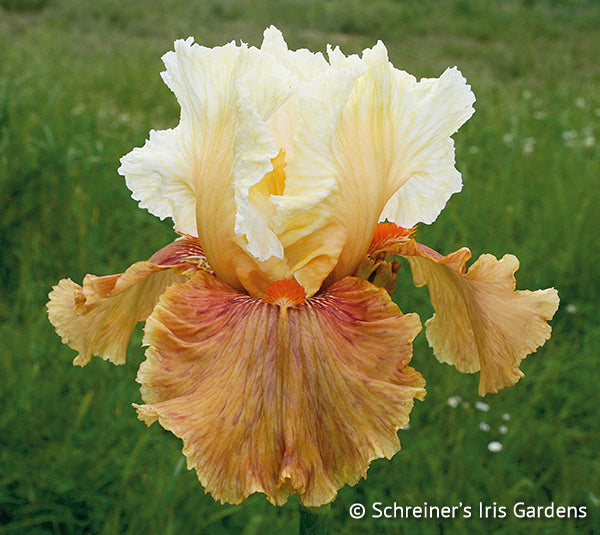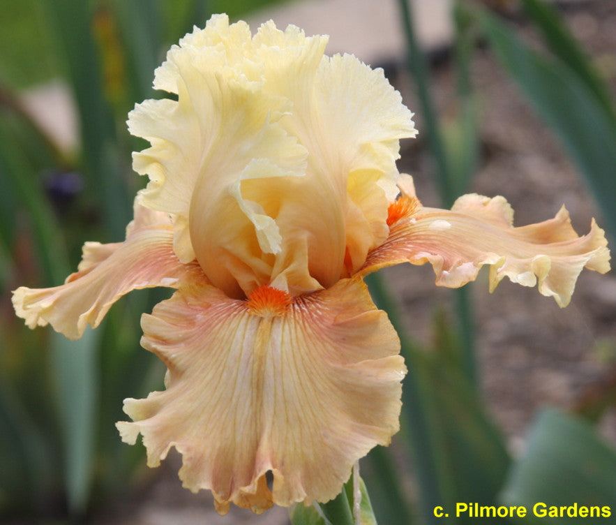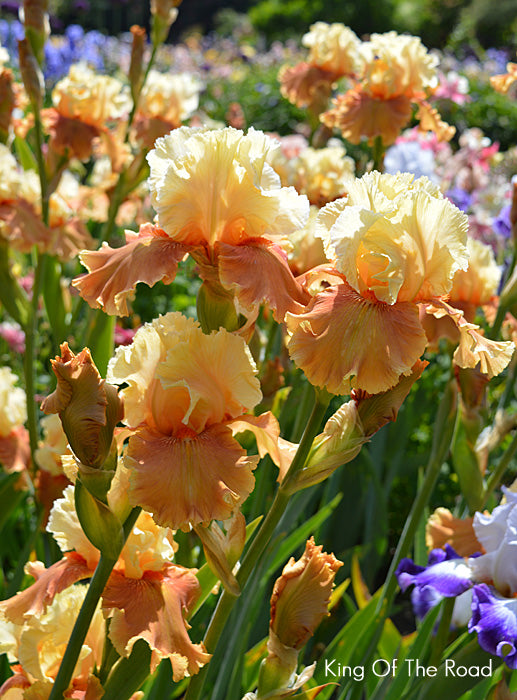 'King Of The Road' (Larry Lauer, R. 2010). Seedling# 2081-21. TB, 36" (91 cm). Late midseason bloom. Standards barium yellow (RHS 10C), salmon (27A) at midrib, cadmium orange (23A) at base; style arms indian yellow (17D); falls hazelnut (167C) blending darker toward light thin chrome yellow (15D) rim, shoulders apricot buff (171A); beards indian orange (32A); ruffled; pronounced sweet fragrance. 'Heaven' X seedling# 608-1: ('Aztec Burst' x 'Betty Dunn'). Lauer 2010.