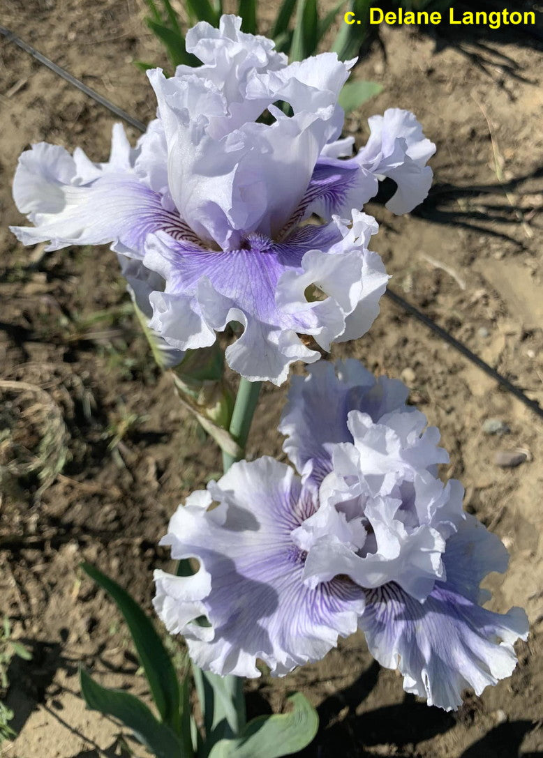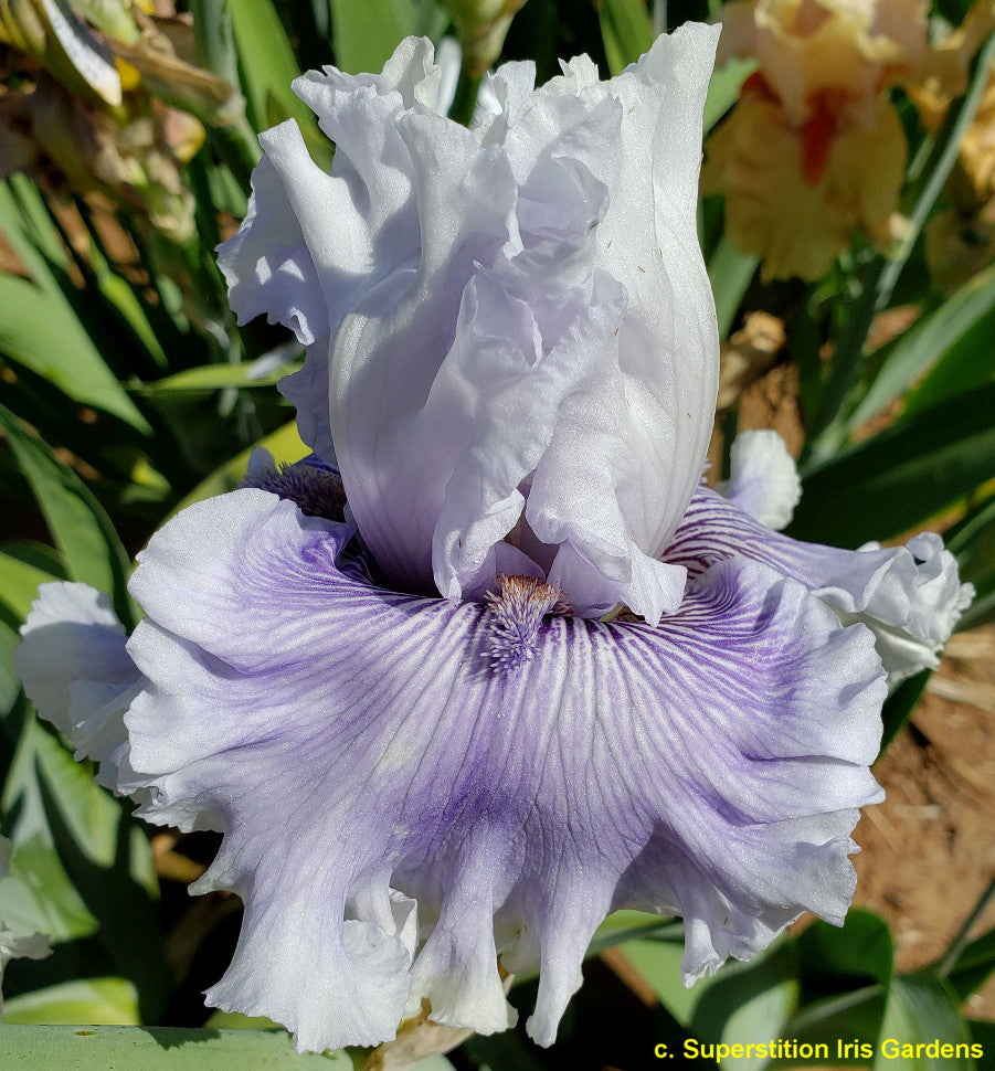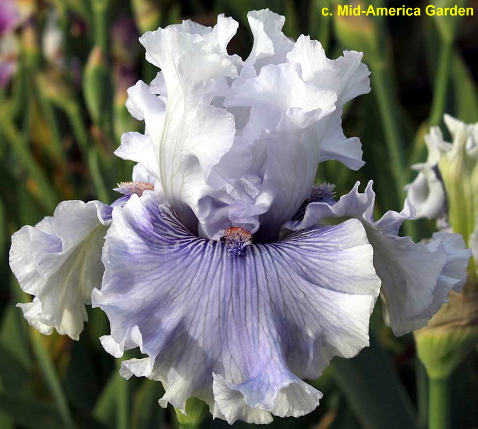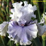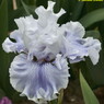 'Kissed By An Angel' (Thomas Johnson, R. 2018). Seedling TG68C. TB, 34" (86 cm), Late bloom. Standards and style arms light blue-white; falls same, near solid medium lavender-blue overlay, light icy blue-white irregular edge; beards based white, tips orange in throat and middle, ends based blue, tips blue; sweet fragrance. Seedling TC339A: ('Hysteria' x Blyth seedling 0201-A: ('Let’s Romp' sibling x 'Mango Daiquiri' sibling)) X 'Haunted Heart'. Mid-America 2018. Honorable Mention 2021.