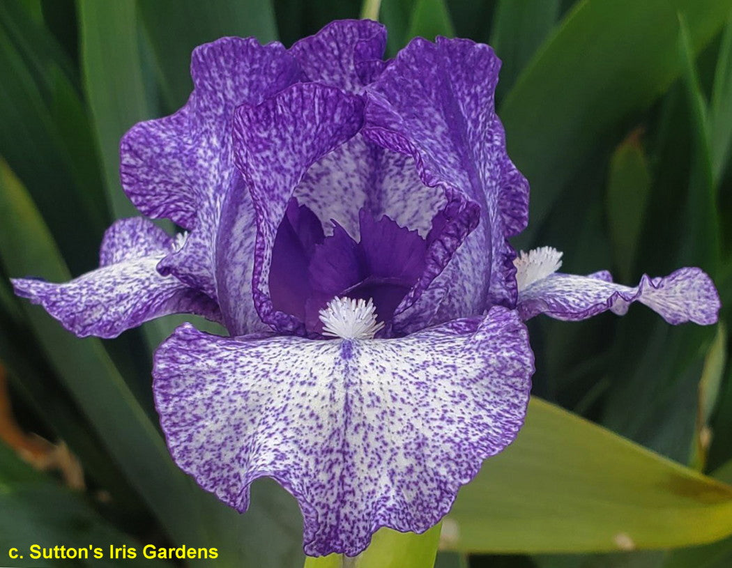 Let Loose' (Michael Sutton, R. 2023) Seedling AF-4-A, SDB, 12" (30.5 cm), Early bloom. Standards white, dotted violet-blue all over; style arms dark violet-blue; falls white, dotted violet-blue all over; beards white base, violet-blue dotted tips; slight sweet fragrance. 'Small Miracle' X 'Magneto'. Sutton's Iris Gardens 2023.