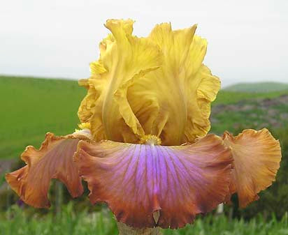 'Magician's Masterpiece' (LeRoy Meininger, R. 1999). Seedling# PP-05. TB, 32" (81 cm), Midseason bloom. Standards rich gold, brown edge; style arms gold, midrib lavender; falls red brown, bright violet flash below beard; beards white, hairs tipped carrot; slight sweet fragrance. 'Party Parfait' X 'Gladys Austin'. Monument, Woodland Iris 1999.