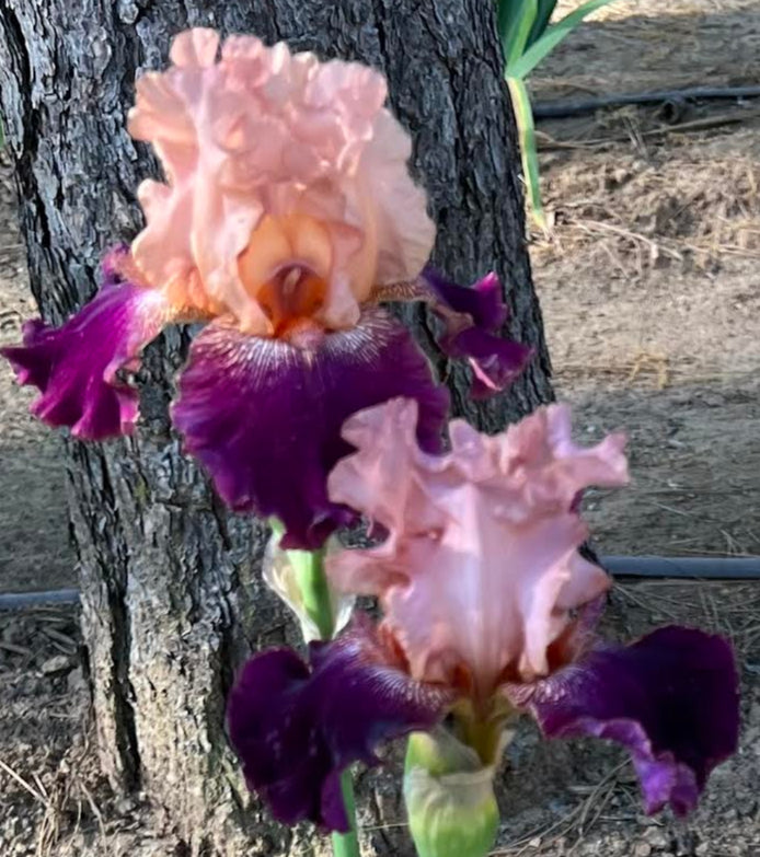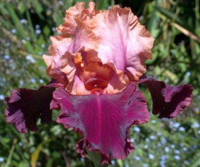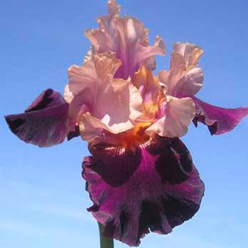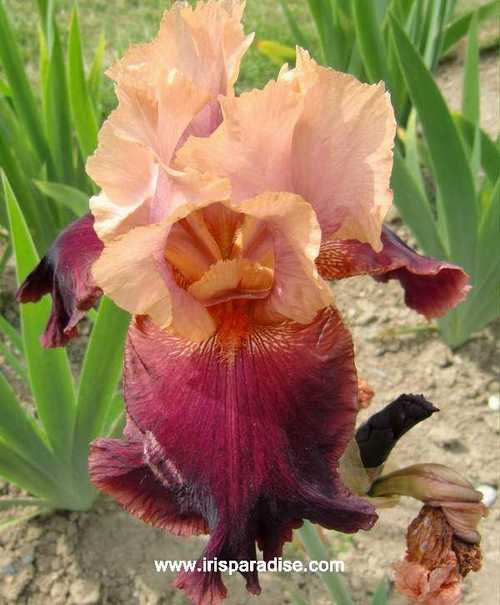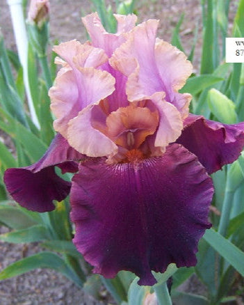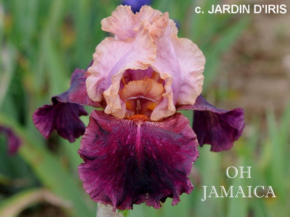 'Oh Jamaica' (Schreiner, R. 1995) Seedling# BB 797-1. TB, 40" (102 cm). Late midseason bloom. Standards buff tan (RHS 173D) with violet midrib; falls maroon (187B); beards orange. Seedling 1983# 2, unknown, X seedling# T 1488-1: (seedling# M 912-AA: ((('October Ale' x 'Hi Top') x (('Wild Ginger' x 'Taste Of Honey') x seedling# Y 866-A: (('Olympic Torch' x 'Brass Accents' sibling) x (((seedling# A 115 x 'Casa Morena') x 'Inca Chief') x 'Dark Chocolate')))) x 'Copper Nugget') x 'San Jose'). Schreiner 1995. Honorable Mention 1997.