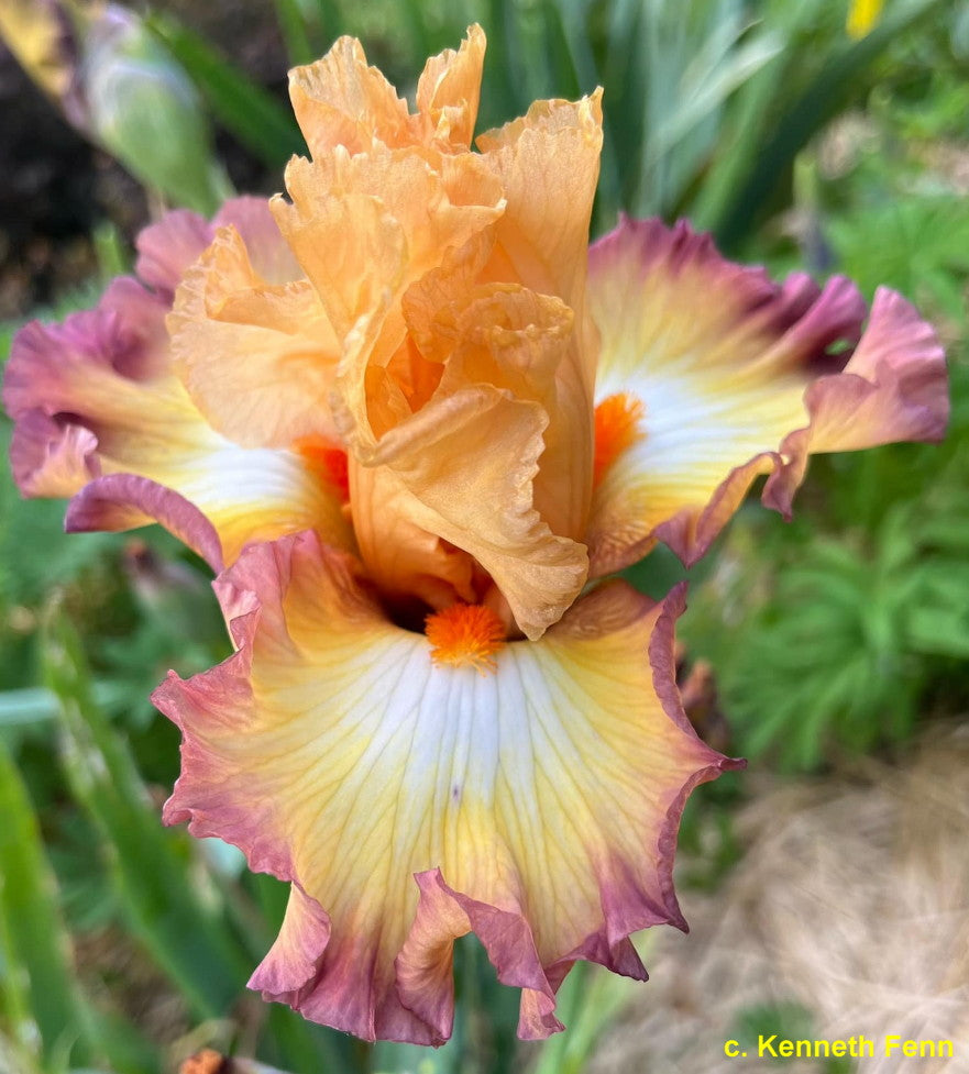 'Oil Painting' (Joseph Ghio, R. 2012) Seedling# 08-147H. TB, 38" (97 cm). Early midseason bloom. Standards mid orange; falls yellow-orange, muted tan edges, white flash around beards; beards tangerine. Seedling# 05-18H: (seedling# 03-49Z2: ('Marching Band' x seedling# 01-46 big: (seedling# 99-34V3: (seedling# 97-41B2, 'New Day Dawning' pollen parent, x 'Seakist') x seedling# 99-4L3: (seedling# 97-13: (seedling# 95-22-I: ('Paint It Black' x 'Romantic Evening') x 'Night Game') x seedling# 97-46N: ('Impulsive' x 'Ocelot')))) x 'Be Original') X seedling# 06-120G: ('Jazz Band' x 'Comfortable'). Bay View 2013. Honorable Mention 2015, Award of Merit 2017.