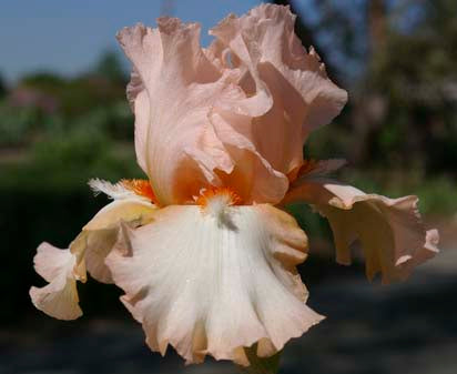 'Pagan's Maiden' (Anna and David Cadd, R. 2002). Seedling# 152-93-1. TB, height 39" (99 cm), late bloom. Standards and style arms light peach pink; falls pinkish peach, center lighter; beards deep orange cantaloupe, large fuzzy horn varying to hook, spoon or flounce; pronounced musky fragrance. 'Triffid' X 'Romantic Mood'. Cadd 2002.