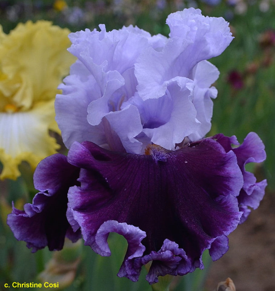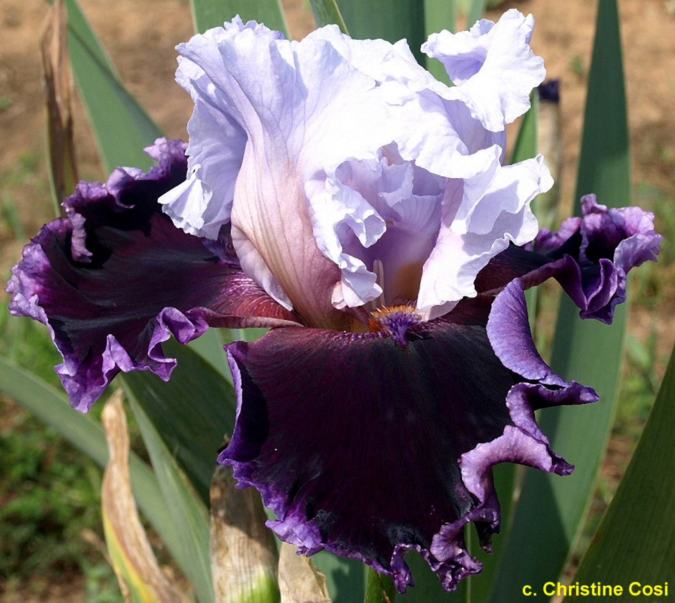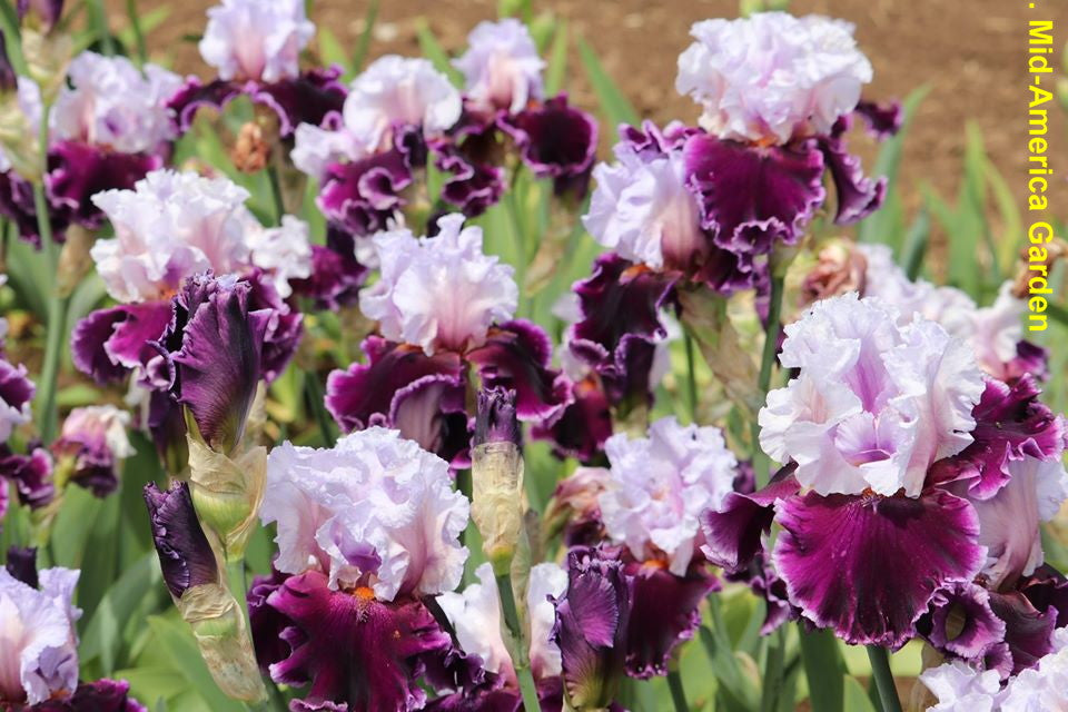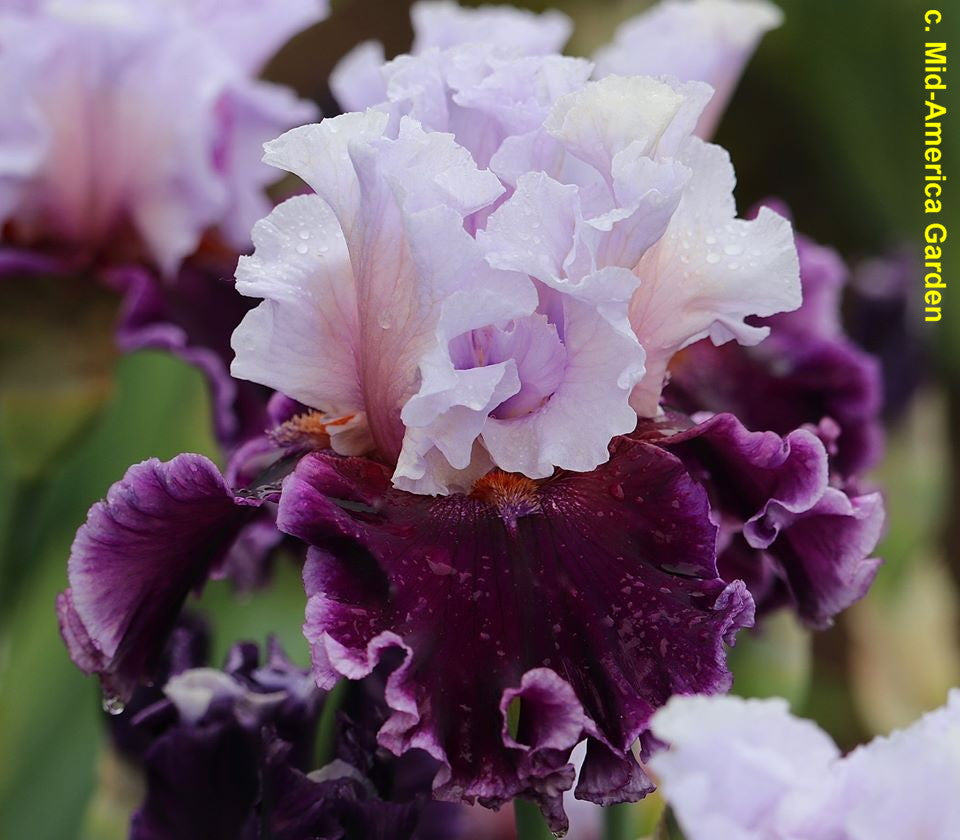 'Pay It Forward' (Thomas Johnson, R. 2020) Seedling TI133A. TB, 35" (89 cm), Early to midseason bloom. Standards icy lavender-blue, salmon-peach flush up midrib; style arms light lavender; falls smooth rich red-violet, narrow light lavender edge; beards orange; slight fragrance. 'Overshadowed' sibling. Mid-America 2020. Honorable Mentions 2022.