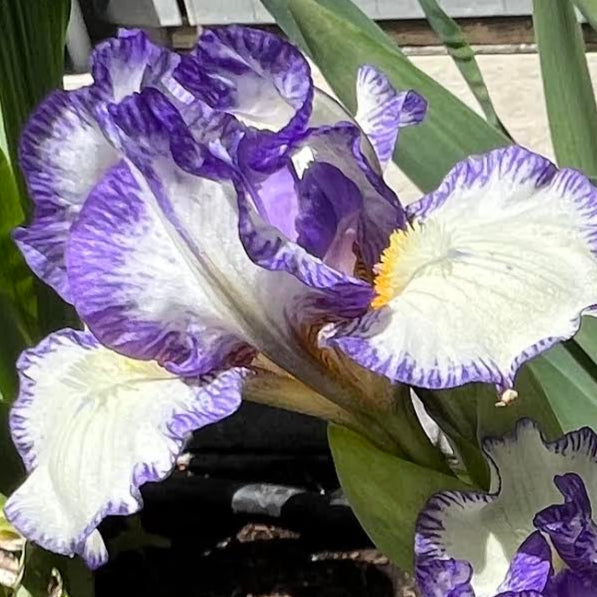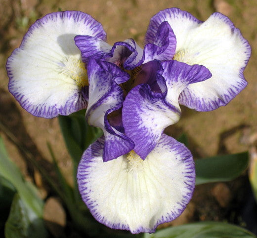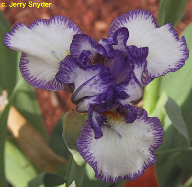 'Petite Ballerina' (Richard Tasco, R. 2010) Seedling# 03-SDB-14-01. SDB, 15" (38 cm), Late midseason bloom. Standards cold white, few blue-violet (RHS 89C) lines on midribs, wide blue-violet edges with plicata dots and lines; style arms blue violet, lighter sides; falls cold white, narrow blue-violet edge with darker blue-violet lines extending slightly out, very short light blue-violet line at end of beard; beards white base, tipped tangerine in throat and middle, tipped white at end; lightly ruffled; slight citrus fragrance. 'All That Magic' X seedling# 01-SDB-36-16: (seedling# 98-SDB-22-04, 'Buttonwood' sibling, x seedling# 96-SDB-20-22: (seedling# 93-03-12: (seedling# 91-62: ('Pal Sam' x 'Auroralita') x sibling) x seedling# 92-01-16: ('Auroralita' x 'Chubby Cheeks'))). Superstition 2010.