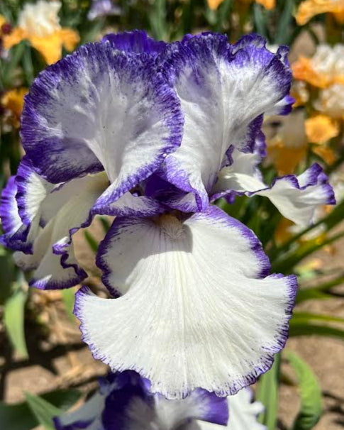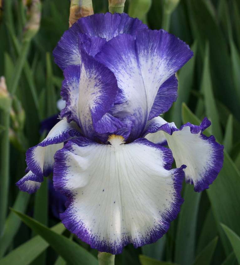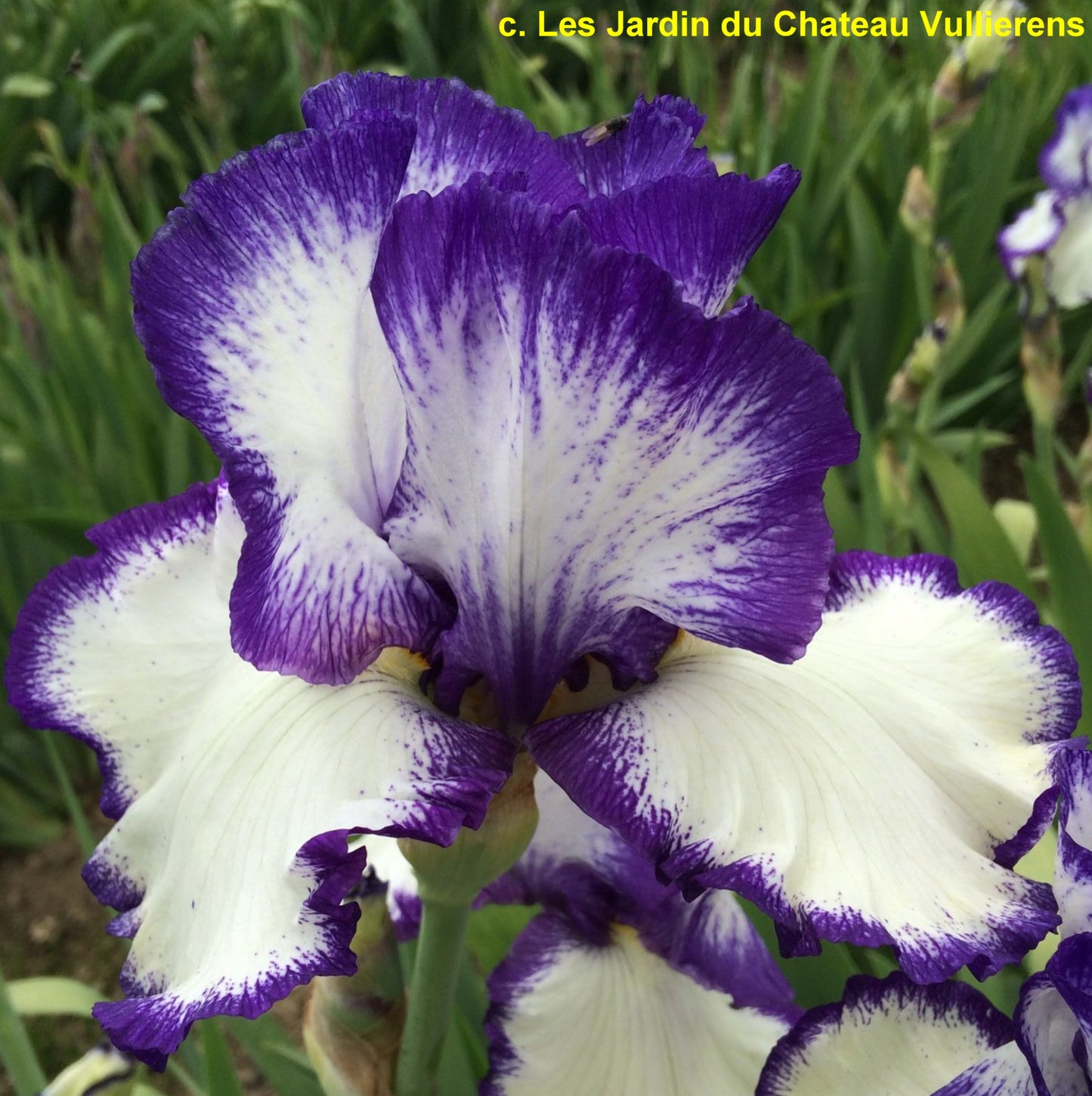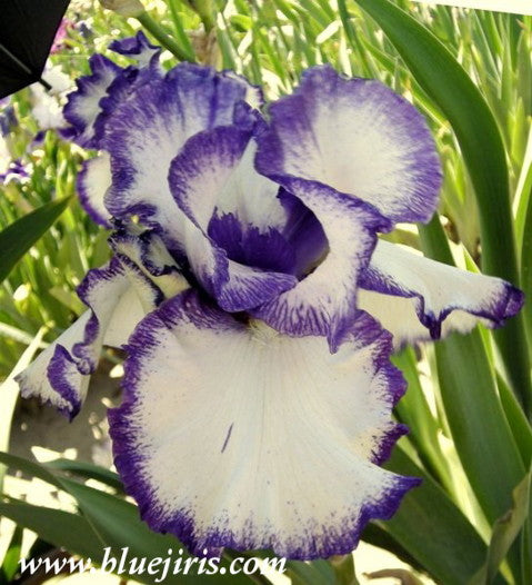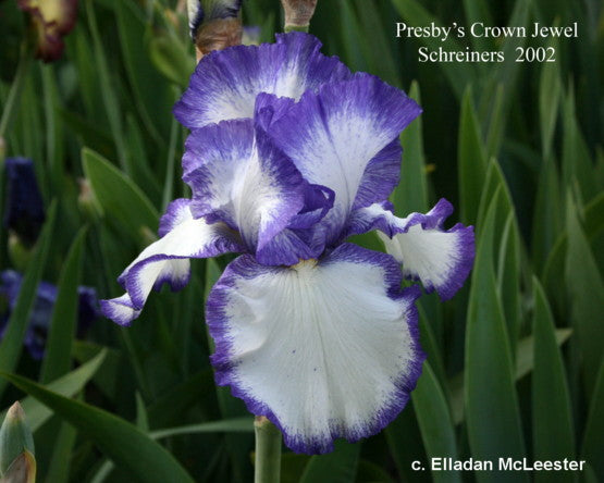 'Presby's Crown Jewel' (H. N. Tragitt by Schreiner's Gardens, R. 2002) TB, 36" (91 cm), Midseason bloom and rebloom. White ground, dark blue violet (RHS 96A) plicata edge; style arms dark blue violet; beards white, hairs tipped yellow. Parentage unknown; seed from Schreiner's Gardens. Schreiner 2002. Honorable Mention 2004; Award of Merit 2007.
