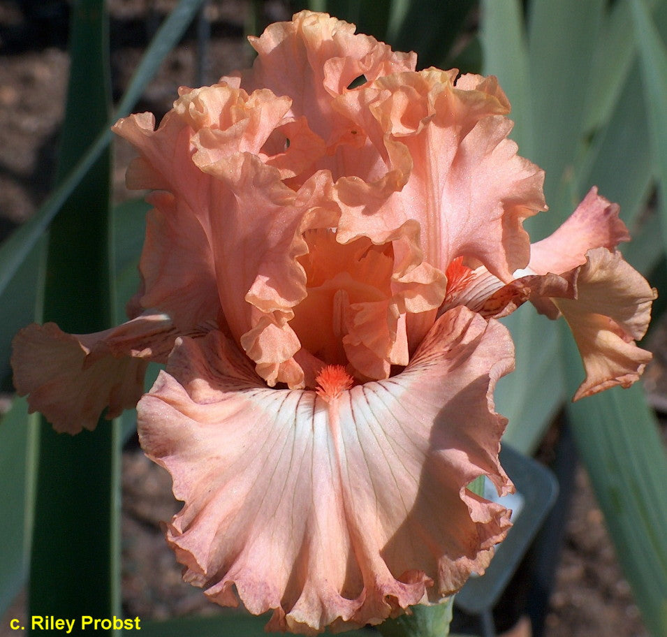 'Pretty Princess' (Richard Tasco, R. 2000). Seedling #95-IB-04-28. IB, Height 24" (61 cm), Midseason bloom. Salmon pink, standards midrib flushed violet; beards coral pink; lightly ruffled. 'Spring Tidings' X 'Chanted'. Superstition 2000.