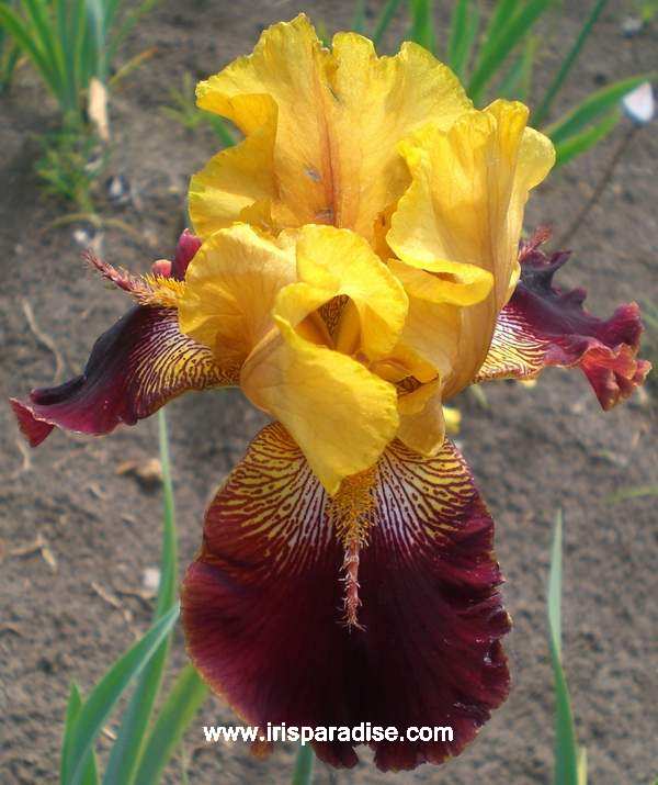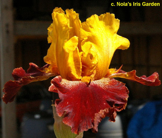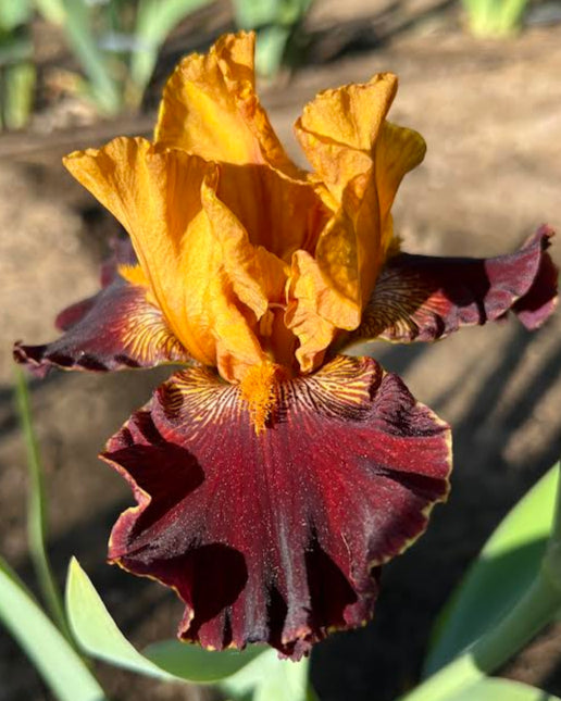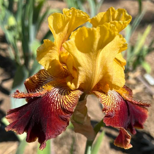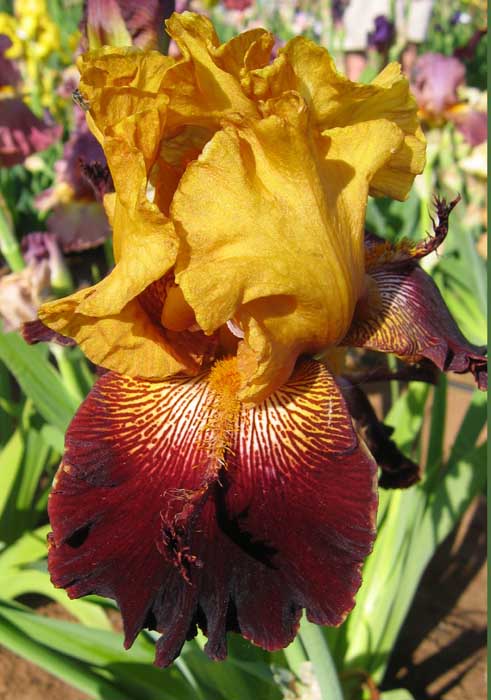 'Red Canyon Glow' (LeRoy Meininger, R. 2000). Seedling# 92-39A. TB, 32" (81 cm), Midseason bloom. Standards butter gold; style arms butter gold, midrib red brown; falls deep red violet; beards russet, 3/4" fuzzy red violet horn. 'Flushed Delight' X ( 'Trick Or Treat' x unknown). Woodland 2000.