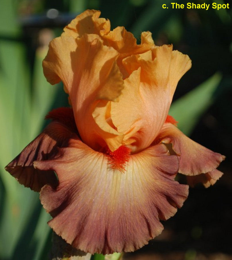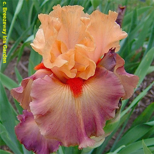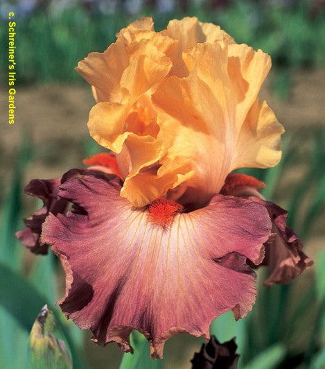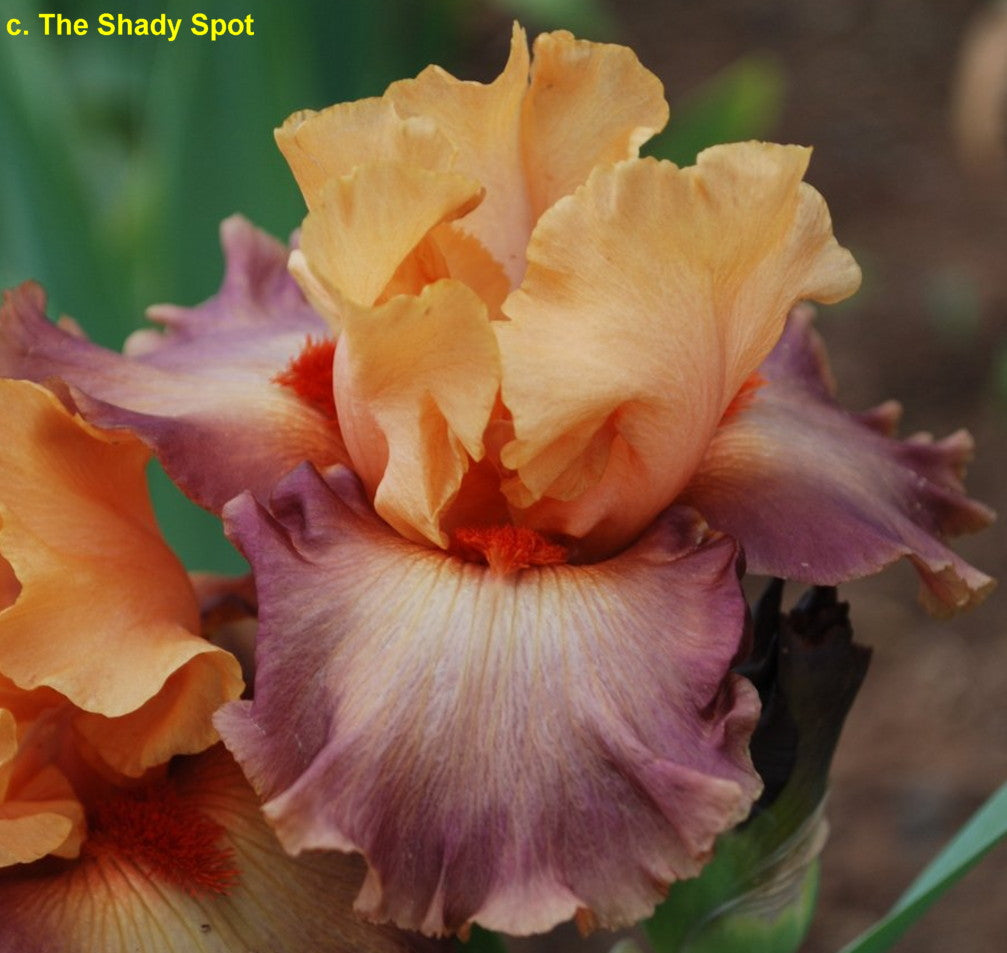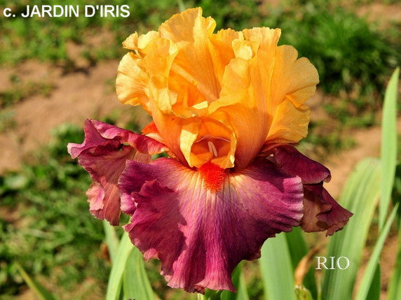 'Rio' (Keith Keppel, R. 2000). Seedling 96-50B. TB, height 38" (97 cm), Midseason to late bloom and rebloom. Standards maize (M&P 10-G-5), midrib faintly flushed peach (10-A-5); style arms slightly deeper (10-IJ-6); falls soft pinkish purple (53-J-1) wash on maize, lighter 1/8" edge and around beard; beards solid burnt orange (3-G-12). 'Braggadocio' X seedling 93-72W, 'Sharpshooter' sibling. Keppel 2001. Honorable Mention 2003; Award of Merit 2005.